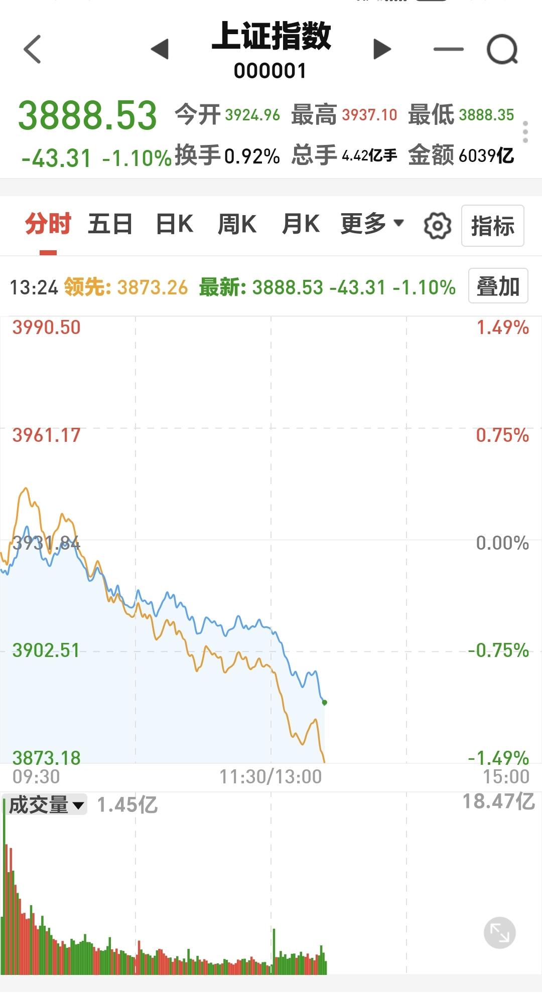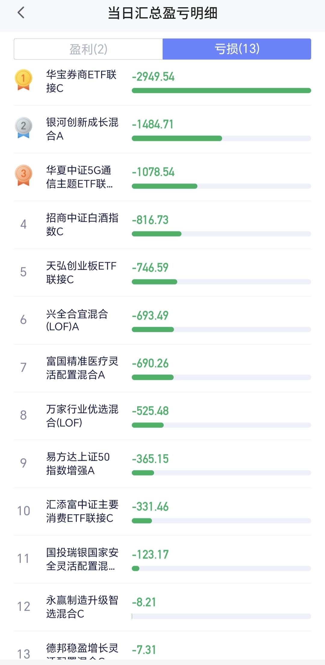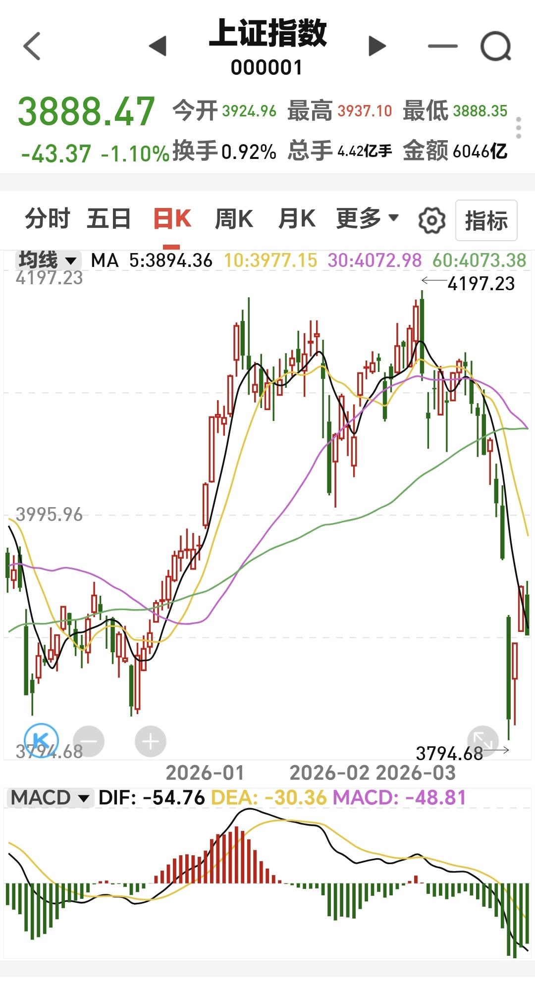 基金:市场震荡向下,但没有必要慌乱 市场下午开盘以后震荡向下,三大指数的下跌幅度都已超过了1%以上,创业板指下跌了1.17%,盘中点位3278点,上证指数下跌了1.09%,盘中点位3888点。 整个股票市场,上涨809家,下跌4603家,涨停45家,跌停9家,上涨家数少于下跌家数。 持有的基金中,盘中估值盈利的只有新能源汽车板块和海外互联网板块,估值亏损金额最大的三个板块是:证券板块,芯片半导体板块,5G板块,估值整体亏损了9444元。 整个基金市场,上涨5535家,下跌14118家,没有上涨幅度超过5%的基金,也没有下跌幅度超过5%的基金。 图9是今天板块的上涨排行榜,上涨幅度最大的三个板块是:锂矿板块,海外医药板块,亚太板块,图10是今天板块的下跌排行榜,下跌幅度最大的三个板块是:金融科技板块,存储芯片板块,恒生科技板块,图11是今天基金的加仓和减仓人数,加仓4147130人,减仓2241603人,加仓人数超过了减仓人数。 整个市场主力资金净流入最多的三个板块是:电池板块,能源金属板块,建筑材料板块,主力资金净流出最多的三个板块是:国企板块,高端制造板块,蓝筹策略板块。 1:下午黄色线还是在蓝色线下方,两条线之间的敞口并不是很大,还存在反转的可能性。 2:两市累计成交13924亿,相比于昨天同期缩量了14%,主力资金净流出633亿,说明在刚才这一轮震荡向下的过程中,并没有大量恐慌盘涌出。 3:下午主要还是观察3881点的得失,如果跌破3881点,甚至是收盘点位在3881点之下,再创新低就是大概率事情,如果还是收在3881点和3955点之间,就还是处于正常的震荡走势状态中。 4:商业航天板块日线级别处于下跌趋势中,前几天下跌跌破了下跌通道的下轨线,进入加速下跌状态。最近一直是在下跌通道下方震荡,日线级别的下跌趋势还没有被改变。 商业航天板块周线级别处于上涨通道中,本周震荡的最低点就是在这个上涨通道下轨线上,并没有跌破这个上涨通道的下轨线,在没有有效破位这个上涨通道下轨线之前,长线持有的人都可以继续持有。 5:Cpo板块日线级别处于上涨通道中,今天的下跌并没有跌破这个上涨通道的下轨线,在有效破位日线级别上涨通道下轨线之前,短线持有的人都可以继续持有。 Cpo板块周线级别处于上涨通道中,现在的位置距离上涨通道的下轨线比较远,小幅度的下跌都改变不了周线级别的上涨趋势,长线持有的人可以继续持有。 6:机器人板块日线级别处于下跌趋势中,前几天下跌跌破了日线级别下跌通道的下轨线,进入了加速下跌走势。最近几个交易日都是在这个下跌通道下方震荡,在日线级别下跌趋势被改变之前,短线持有的人都需要保持谨慎的态度。 机器人板块周线级别的上涨趋势已经被破坏,而且是有效破位了,周线级别的上涨趋势,长线持有的人需要注意风险。 到现在为止还是没有跌破3881点,到现在为止的震荡还是在正常的范围之内,只要不跌破3881点的震荡都不要惊慌,继续观察盘面的状态,有观点以后我会第一时间分享。 今天究竟应该怎么办?我会在评论区留言。 置顶文章是我参加活动的,大家可以点进去看一下有没有点赞,没有点赞的人帮忙点一下赞,谢谢大家的支持。
