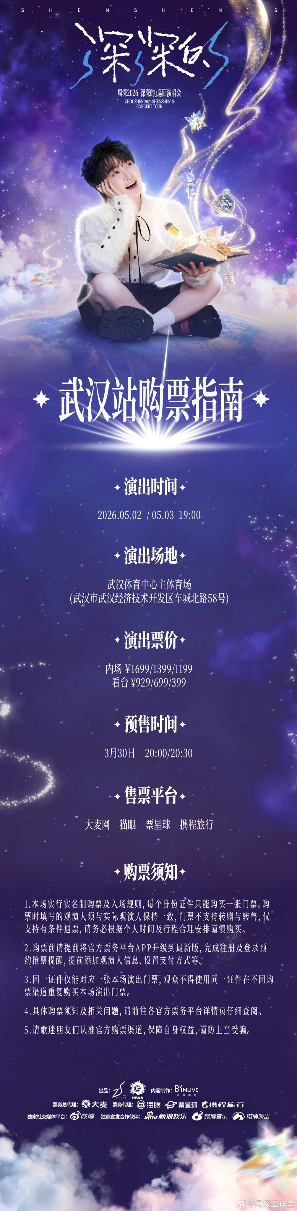 周深武汉预售时间 周深武汉演唱会终于官宣!3 月 30 日 20:00/20:30 抢票,五一假期 5.2、5.3 现场见,准备好拼手速啦~