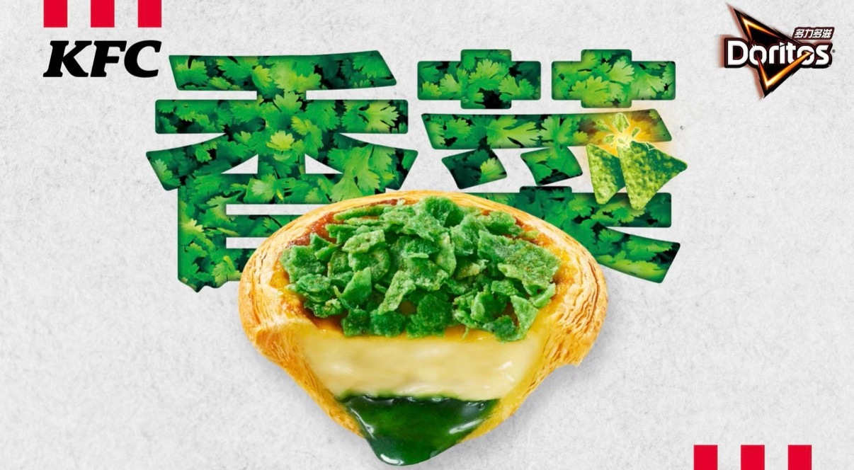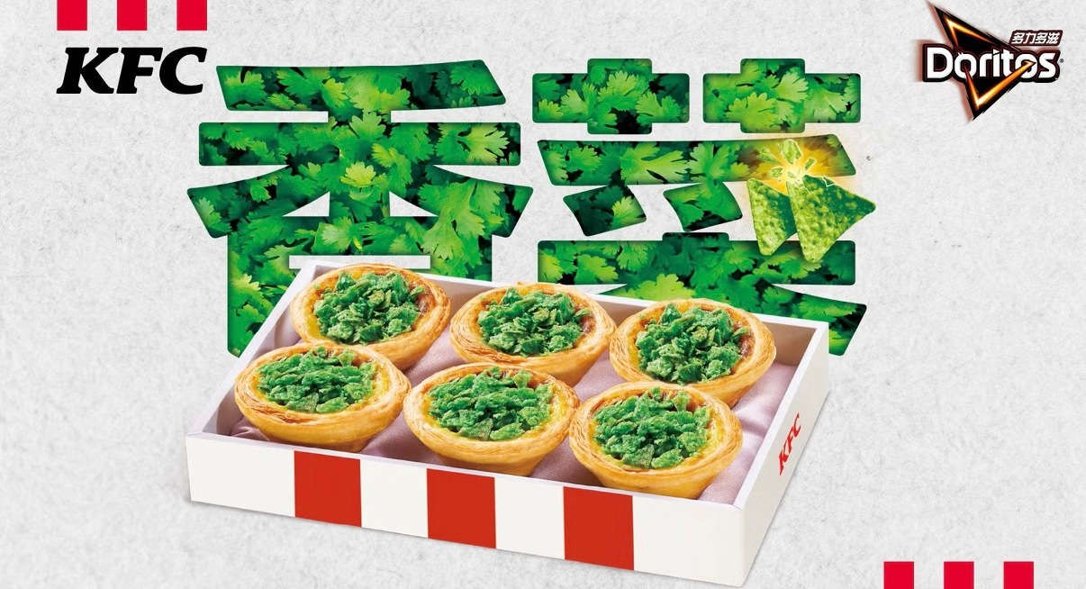 台湾肯德基推出「香菜蛋挞」上面是香菜多力多滋脆片,内馅是特制流心香菜风味酱