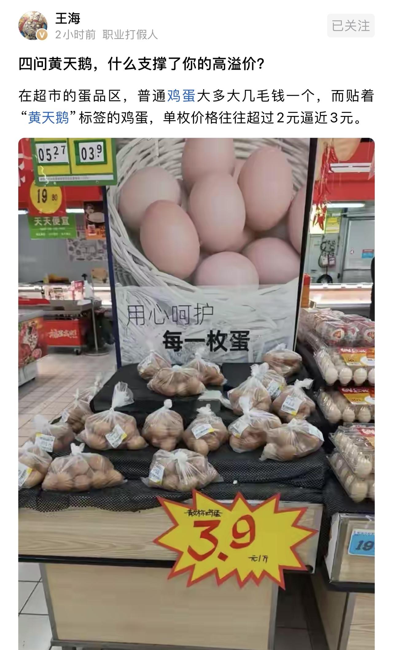 感觉王海是没招了,现在只能吐槽黄天鹅鸡蛋价格贵了。他就是想告诉我们,黄天鹅的鸡蛋营养价值和普通鸡蛋差不多,还有普通鸡蛋一斤才三块九,黄天鹅鸡蛋一斤要好几十。意思就想告诉消费者不要去买黄天鹅的鸡蛋,别让黄天鹅赚你的钱。 不得不说王海到现在还想着搞黄天鹅,人家都已经拿出了检测报告,检测报告已经明确表示没有角黄素了。现在大家也都期待胖东来去起诉王海,让王海承担这一次打假失败的后果。毕竟这一次大家觉得王海有点恶心了,何必一直揪着人家黄天鹅不放。