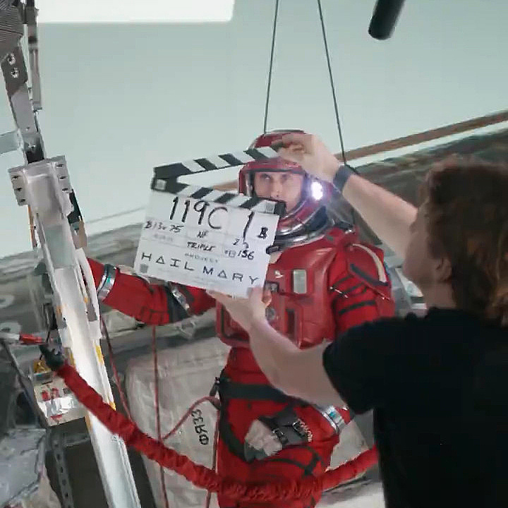 瑞恩·高斯林在《挽救计划》片场穿着宇航服的照片