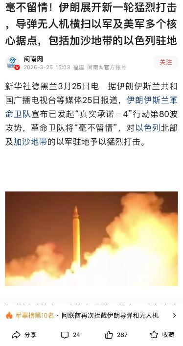 太喜欢伊朗这个性了!对付美以霸权,就得往痛处打! 最新消息,新华社德黑兰 3 月 25 日电 据伊朗伊斯兰共和国广播电视台报道,伊朗革命卫队官宣 “真实承诺-4” 行动第 80 波攻势,剑指以色列北部及加沙以军驻地,态度强硬毫不手软! 这波攻势看得人热血沸腾,伊朗这次是真没含糊,不仅盯着以色列的军事要害打,还顺带敲了敲美军在中东的多个据点。 根据革命卫队的公告,特拉维夫、布内布拉克这些以色列核心城市,还有北部的谢莫纳镇都遭了导弹袭击,就连科威特的阿里・萨利姆空军基地、巴林的谢赫伊萨空军基地,以及约旦的美军阿兹拉克基地,也被导弹和无人机精准命中,行动至今还在持续推进。 可能有人会问,伊朗怎么突然发起第 80 波攻势? 其实这根本不是突发行动,而是对长期挑衅的集中反击。 回顾这几个月,以色列在加沙地带的动作就没停过,联合国 3 月 25 日刚发布的报告显示,停火协议生效后,加沙已有 651 人丧生,仅最近就有近 300 人死于军事冲突,而以色列还在加速约旦河西岸的定居点建设,一步步侵蚀 “两国方案” 的基础。 更让人不齿的是,美国一边呼吁停火,一边偷偷给以色列递刀子,过去一年对以军援超 179 亿美元,就在不久前还批准了 6.8 亿美元的武器销售,给以色列的 “联合直接攻击弹药” 改装套件,正是用来轰炸加沙平民的主要装备。 伊朗的 “真实承诺-4” 行动,从 3 月 22 日的第 73 波打到现在的第 80 波,短短几天内攻势一波接一波,看得出来是早有准备。 之前的第 74 波行动中,伊朗就用 “伊马德”“法塔赫” 等多款导弹,瘫痪了美军中央司令部的补给链,让美以的防空体系陷入混乱。 这次第 80 波更是精准打击以色列北部司令部,直接敲掉以军的指挥中枢,这种稳准狠的打法,就是要告诉美以:挑衅的代价你们承受不起。 很多人说伊朗硬刚美以是自不量力,但看看实际情况,美国这个 “纸老虎” 的本质暴露无遗。 嘴上喊着维护地区和平,却动辄给以色列输送上百亿军援,可真到了要直面伊朗反击的时候,美军在中东的基地只能被动防御。 伊朗很清楚,对付霸权主义不能退,越退越会被得寸进尺。 过去美国对伊朗的制裁、封锁从没停过,以色列更是多次袭击伊朗核设施和军事目标,联合国专家都谴责以色列的行为违反国际法,造成大量平民伤亡,伊朗的反击不过是正当防卫。 更值得注意的是,伊朗的打击始终瞄准军事目标,尽量避免平民伤亡,这和以色列在加沙的无差别轰炸形成了鲜明对比。 根据权威统计,以色列的袭击导致加沙地带近 7 万人死亡,而伊朗的行动中,即便有民用设施受损,也都是因为军事目标邻近,这背后体现的是对国际法的尊重,也是伊朗的战略克制 —— 不是要扩大冲突,而是要打疼挑衅者。 其实伊朗的强硬,本质上是对地区正义的坚守。巴以冲突拖了这么久,核心问题就是以色列的非法占领和美国的双重标准。 美国总想着靠军援和制裁掌控中东,可伊朗用一次又一次的反击证明,霸权主义在正义面前站不住脚。 179 亿美元的军援看似吓人,但在伊朗坚定的反击面前,这些武器不过是堆废铁,美军在中东的多个基地被袭击,就是最好的证明。 当然,我们不希望冲突升级,毕竟战争受苦的还是普通百姓。但对付像美国这样的 “纸老虎”,就该学伊朗的性子,该强硬时绝不手软。你越怕它,它越嚣张;你敢直面反击,它反而没了脾气。 现在国际社会都在呼吁停火,但停火不能靠妥协,得靠实力平衡。伊朗的 “真实承诺-4” 行动,就是用实力告诉美以,想要和平就得坐下来谈判,想要靠武力解决问题,注定会遭到坚决反击。 希望这次伊朗的攻势能让美以清醒过来,停止非法占领,停止军火输送,回到谈判桌前。 也期待更多国家能站出来维护正义,让中东地区早日摆脱战乱,让普通百姓能过上安稳日子。对付霸权,就得痛打落水狗,伊朗这波操作,确实让人解气!