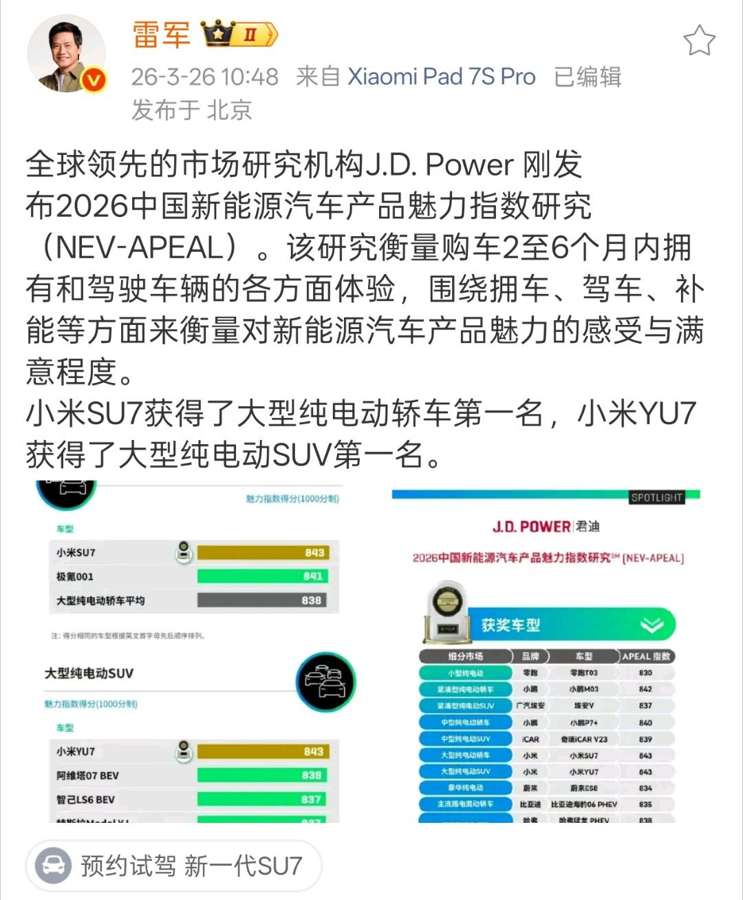 雷军谈小米双车获JDPower魅力榜第一小米汽车又双叒叕拿下了一项相当重量级的荣誉:小米 SU7、YU7 双双登顶 J.D. Power 2026 魅力榜,这便是源自车主内心最真实、最具象化的认可!