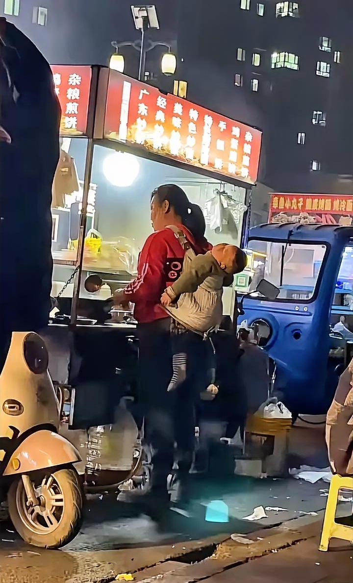 前面锅里炒的是生活,后面身上背的是希望,两岁孩子在妈妈背上睡着了,孩子的头和脚在随着妈妈炒饭颠勺的动作而摆动,看着很搞笑,却令人极度心酸。 这是近期某地夜市的一幅场景,市井生活的烟火气息十足,但是这对母子却显得格格不入。 如果不是家庭困难,没人会把孩子大半夜带出来遭罪,尽管孩子母亲的炒饭动作已经尽量放轻了,但是孩子看起来依旧十分难受。