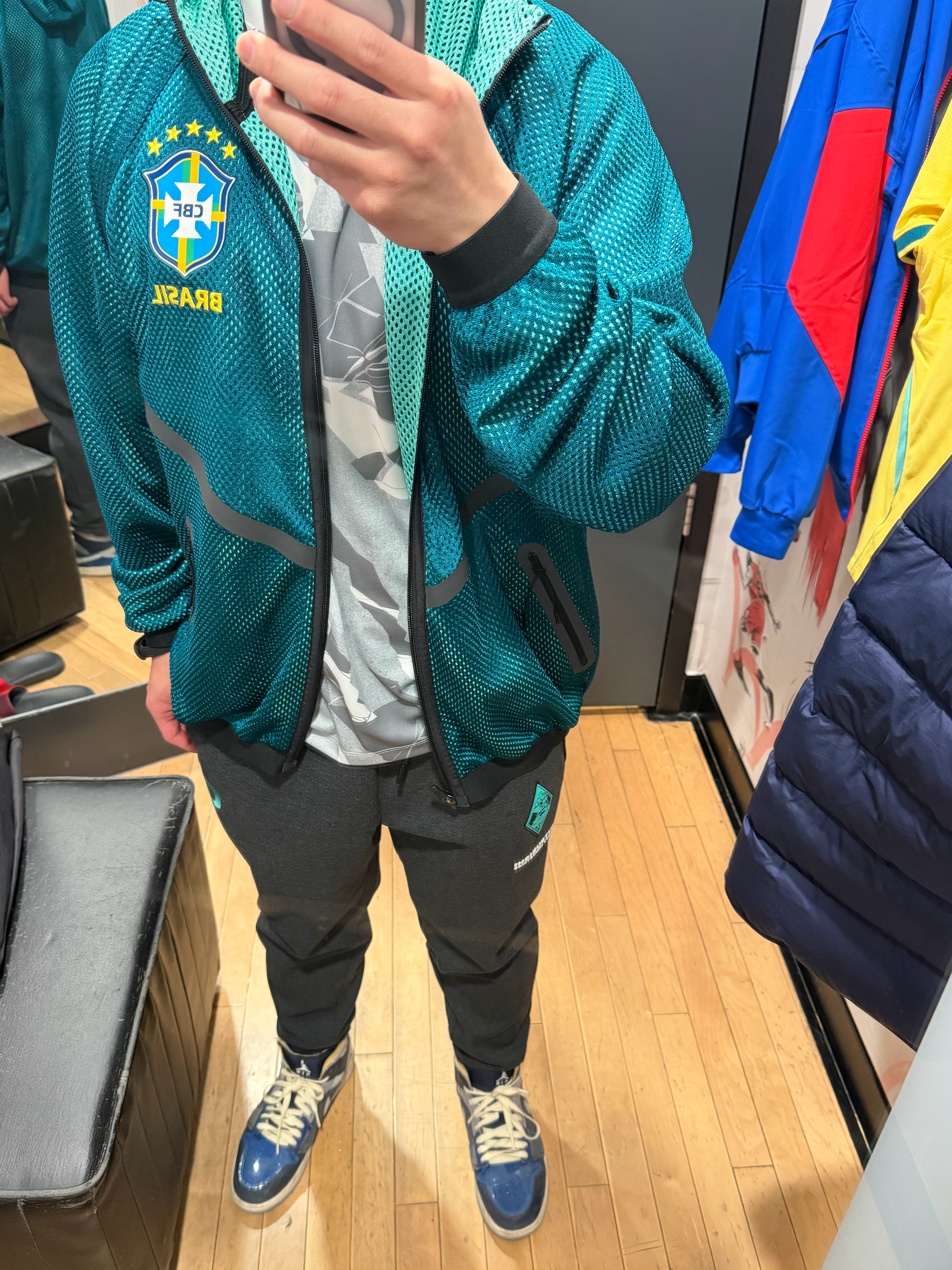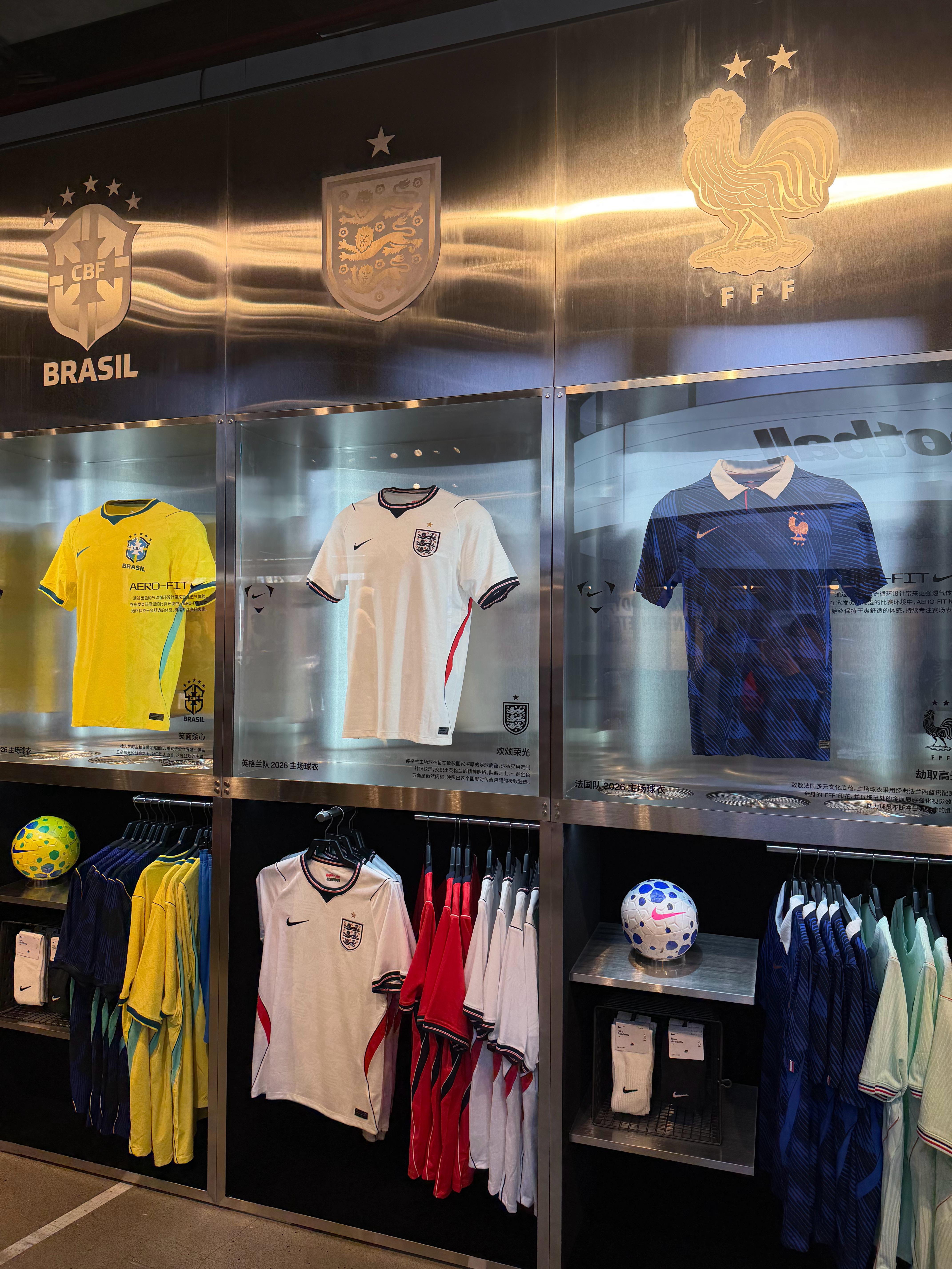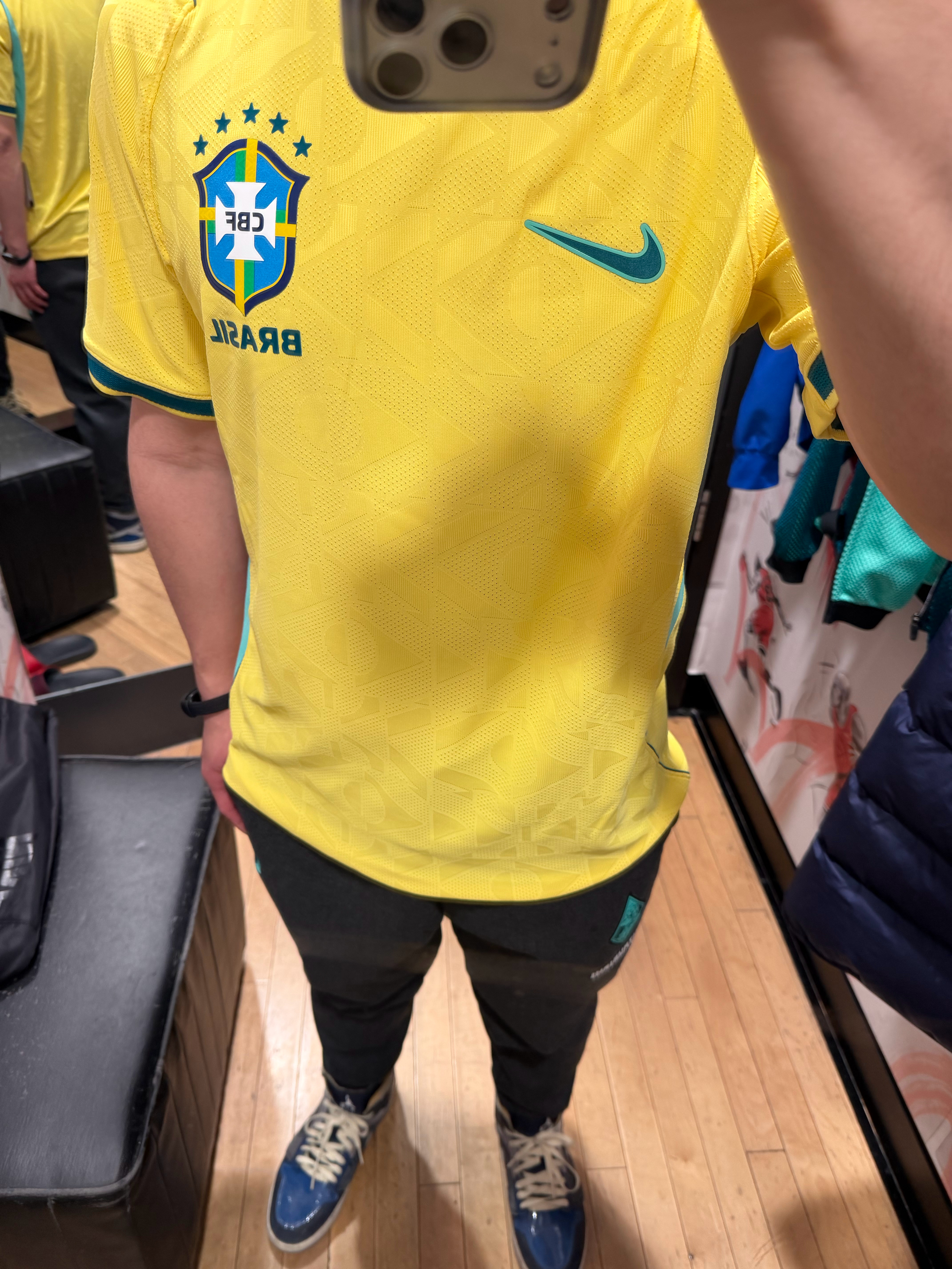 昨日探店-耐克淮海中路店国足主场球员版售罄,只能试穿下巴西的新球衣了。贤聊球衣世