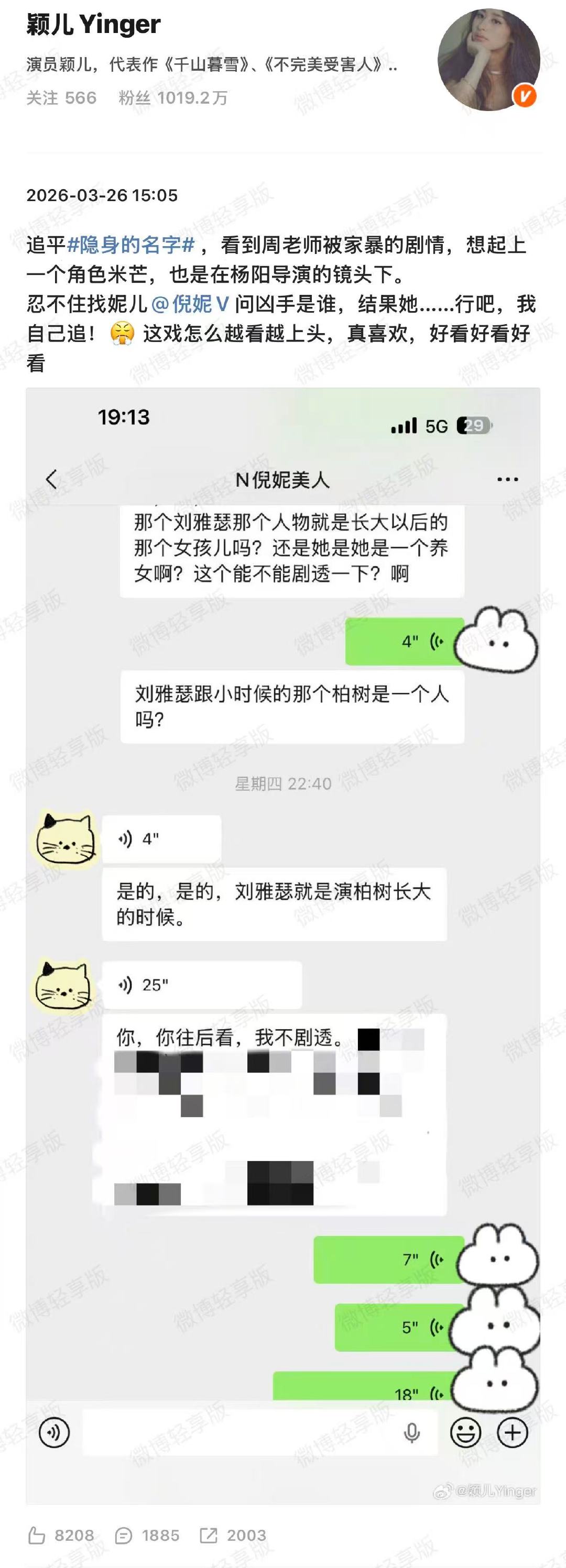 颖儿忍不住找倪妮剧透颖儿问倪妮凶手 3月26日,发文称自己在追《隐身的名字》时,忍不住找剧透问凶手是谁,“忍不住找妮儿问凶手是谁,结果她……行吧,我自己追!😤 这戏怎么越看越上头,真喜欢,好看好看好看 ”