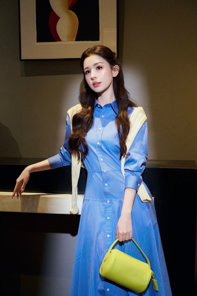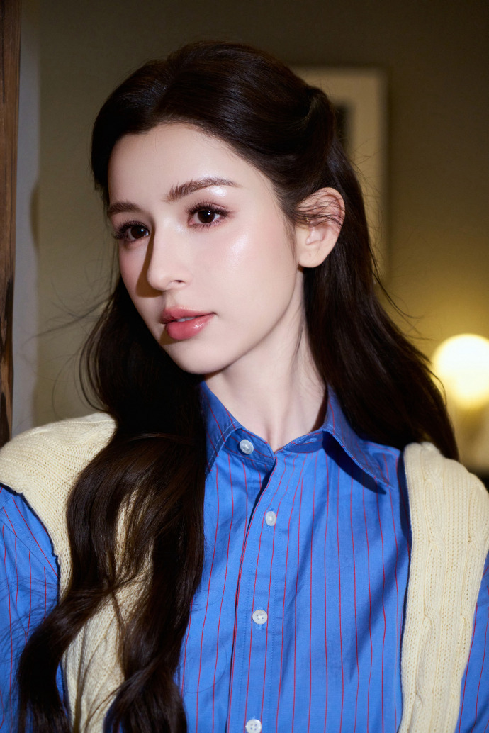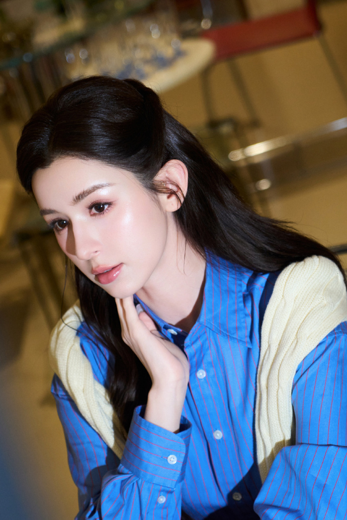 哈妮克孜好震撼的新疆美人 蓝衬衫的利落线条衬出挺拔身姿,米白披肩增添柔和感,将美式风尚的经典与新疆美人的明艳完美融合。哈妮克孜邂逅美式隽永风尚