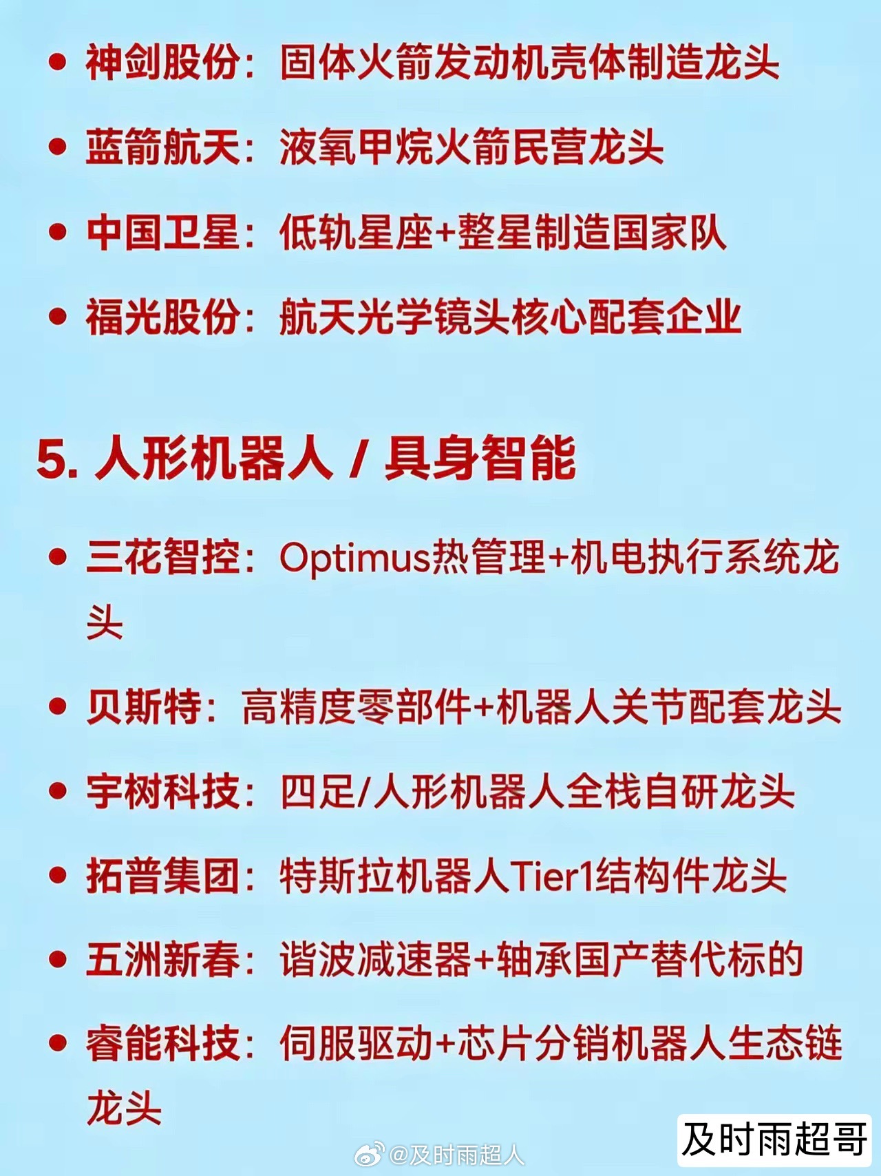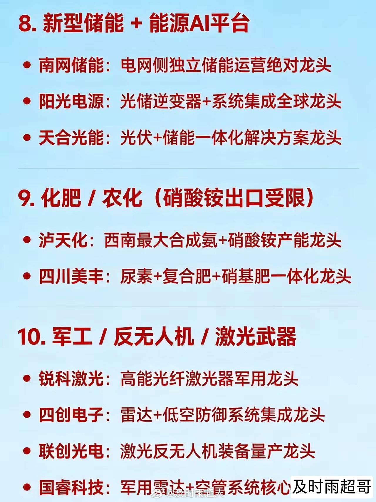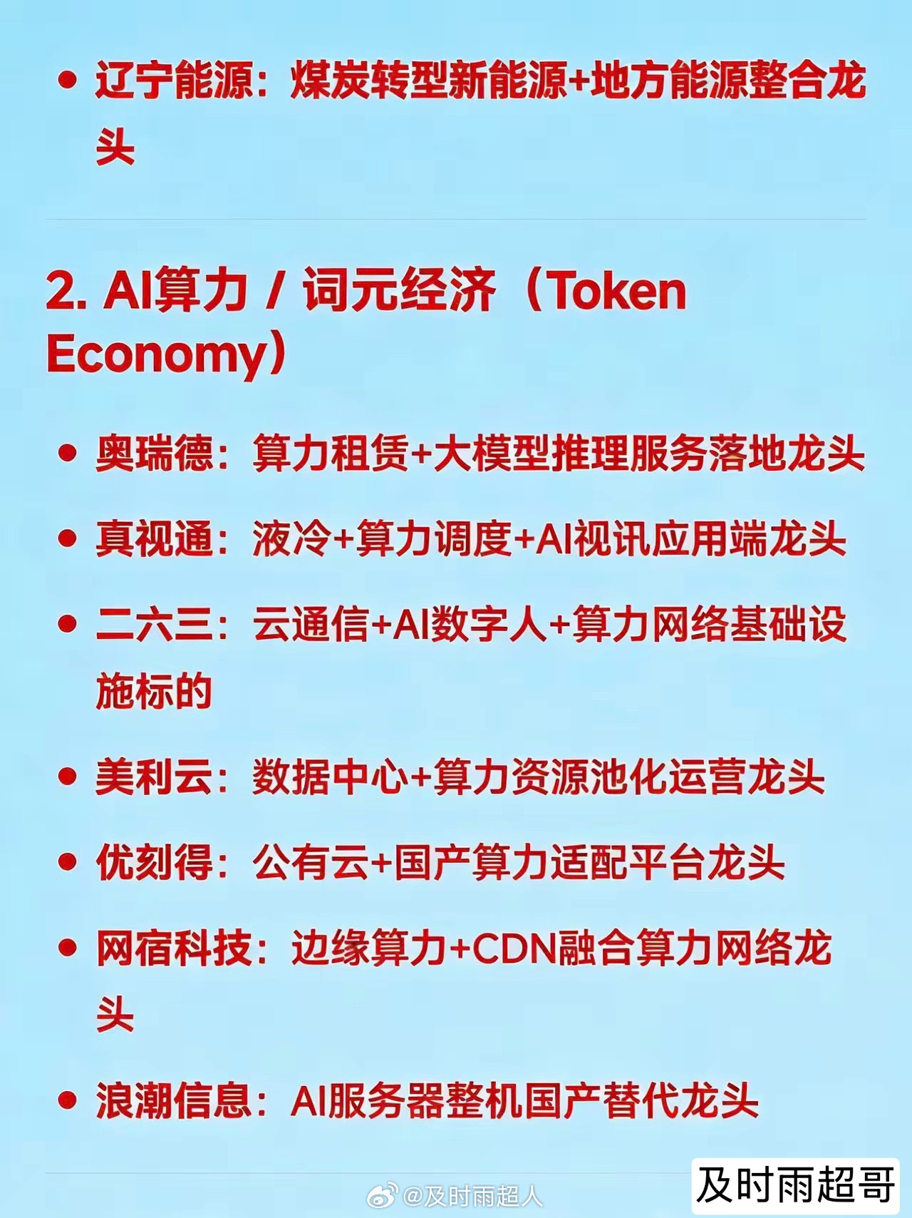 2026年3月26日十大热点科技及其产业链核心龙头1. 算电协同 / 绿色电力(含碳交易、氢能、国企改革)华电辽能:算电协同+绿电+碳交易+央企改革多题材总龙头节能风电:风电运营+储能协同的绿电核心龙头粤电力A:超超临界火电转型绿电标杆韶能股份:生物质发电+抽水蓄能+数据中心绿电供应龙头中闽能源:抽水蓄能+海上风电区域龙头金开新能:“绿电+算力租赁”双轮驱动代表华银电力:虚拟电厂+火电灵活性改造龙头辽宁能源:煤炭转型新能源+地方能源整合龙头2. AI算力 / 词元经济(Token Economy)奥瑞德:算力租赁+大模型推理服务落地龙头真视通:液冷+算力调度+AI视讯应用端龙头二六三:云通信+AI数字人+算力网络基础设施标的美利云:数据中心+算力资源池化运营龙头优刻得:公有云+国产算力适配平台龙头网宿科技:边缘算力+CDN融合算力网络龙头浪潮信息:AI服务器整机国产替代龙头3. 光通信 / 光模块 / 光纤光缆通鼎互联:G.657.A2光纤+光器件一体化龙头长飞光纤:空芯光纤+算力网络光缆核心供应商中利集团:光通信+光伏双主线协同龙头华脉科技:FTTR+光接入设备区域龙头铭普光磁:800G光模块+磁性器件配套龙头4. 商业航天 / SpaceX产业链再升科技:星舰高温绝热材料独家供应龙头西部材料:航天合金结构件核心供应商神剑股份:固体火箭发动机壳体制造龙头蓝箭航天:液氧甲烷火箭民营龙头中国卫星:低轨星座+整星制造国家队福光股份:航天光学镜头核心配套企业5. 人形机器人 / 具身智能三花智控:Optimus热管理+机电执行系统龙头贝斯特:高精度零部件+机器人关节配套龙头宇树科技:四足/人形机器人全栈自研龙头拓普集团:特斯拉机器人Tier1结构件龙头五洲新春:谐波减速器+轴承国产替代标的睿能科技:伺服驱动+芯片分销机器人生态链龙头6. 福建自贸区 / 海峡两岸 / 京台高速平潭发展:平潭综合实验区唯一上市平台龙头福建水泥:海峡基建+区域建材保障龙头晋亿实业:高铁扣件+两岸交通基建配套龙头7. 消费电子 + AI终端转型立讯精密:AI眼镜+800G光模块+汽车电子平台型龙头信维通信:天线模组+北美大客户验证突破龙头共进股份:800G交换机代工+唐山国资入主转型龙头8. 新型储能 + 能源AI平台南网储能:电网侧独立储能运营绝对龙头阳光电源:光储逆变器+系统集成全球龙头天合光能:光伏+储能一体化解决方案龙头9. 化肥 / 农化(硝酸铵出口受限)泸天化:西南最大合成氨+硝酸铵产能龙头四川美丰:尿素+复合肥+硝基肥一体化龙头10. 军工 / 反无人机 / 激光武器锐科激光:高能光纤激光器军用龙头四创电子:雷达+低空防御系统集成龙头联创光电:激光反无人机装备量产龙头国睿科技:军用雷达+空管系统核心供应商免责声明:发文涉及资讯图等内容来自网络公共信息。仅供参考,不构成投资建议。