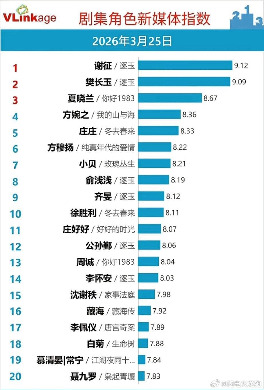 逐玉角色霸榜!3月25日角色指数榜太狠了《逐玉》直接杀疯了!谢征、樊长玉包揽前二,俞浅浅、齐旻、公孙鄞、李怀安全部上榜,前14名里占了6席,这统治力简直离谱!《你好1983》的夏晓兰稳居第三,《我的山与海》《冬去春来》也各有角色入围,不过在《逐玉》的霸榜气势下,都显得稍逊一筹。从数据来看,《逐玉》的角色热度断层领先,不管是主角还是配角,都牢牢抓住了观众的注意力,妥妥的年度爆款预定。这波是剧带人还是人带剧?你心中的top1是谁?