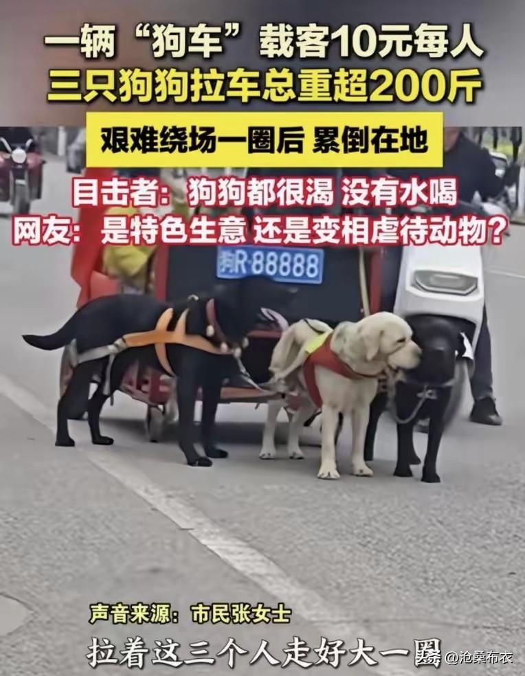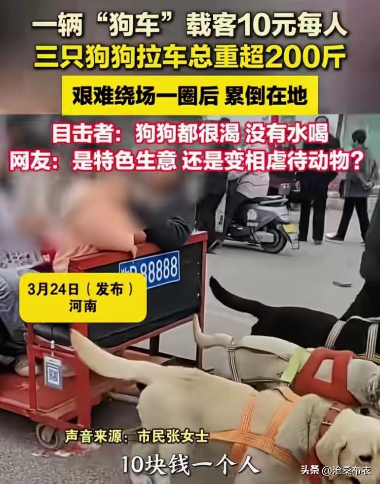 景区狗力车拉人三只金毛累到瘫倒在地! 河南某地庙会上,有人用3只金毛犬拉车载人挣钱每趟10元,主人为了挣钱,叫3只金毛犬不停地跑车,最终,三只金毛犬累倒在地。 网友:这是雇用狗工!这是虐待狗狗的行为!