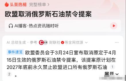脸都不要了! 欧盟光速认怂,取消俄石油禁令,这波操作,把“双标”和“虚伪”玩到了极致,说着最硬的气话,挨着重拳狠打,最后乖乖低头认怂! 其实欧盟早就规划好了一套“彻底去俄能源化”的方案,这次取消的禁令提案,原本是要以立法形式敲定,要求欧盟各国在2027年底前,彻底断绝和俄罗斯的石油进口往来,哪怕日后俄乌冲突平息、对俄制裁放宽,这项禁令也会一直生效。 为了能顺利推进这项提案,欧盟甚至特意把提交时间定在4月15日,也就是匈牙利议会选举结束三天后,算盘打得不可谓不精。 欧盟之所以这么算计,全因为匈牙利是欧盟内部出了名的“亲俄派”,对俄罗斯石油的依赖度极高。匈牙利总理欧尔班一直公开反对对俄能源禁令,甚至直言制裁只会毁掉欧洲经济,还曾威胁要否决对乌援助方案,以此逼迫欧盟放弃相关禁令。 欧盟原本想等匈牙利选举结束,寄希望于反对派上台后,能顺利通过禁令,却没料到半路杀出个“程咬金”。 这个“程咬金”,就是持续升级的中东局势。随着美以伊战事爆发,霍尔木兹海峡的航运几乎陷入瘫痪,全球能源供应链遭到严重冲击,国际油价一路飙升,很快就突破了每桶100美元的关口。 这对本就脆弱的欧盟能源体系来说,无疑是致命一击,毕竟欧盟对海湾地区的成品油依赖度高达40%,原油依赖度也有13%,航运受阻直接导致欧洲能源进口成本暴涨。 短短十天时间,欧洲在化石燃料进口上就多支出了30亿欧元,荷兰TTF天然气期货价格从每兆瓦时32欧元飙升到60欧元以上,德国普通家庭的年均能源账单更是逼近5000欧元,有近十分之一的欧洲居民面临供暖不足的问题。 更头疼的是,欧洲的工业生产也受到了严重影响,化工、钢铁、汽车等行业纷纷减产甚至外迁,原本就低迷的经济雪上加霜。 雪上加霜的是,美国竟然先一步松了口。早在3月12日,美国财政部就发布了正式许可文件,宣布对3月12日前已经装船的俄罗斯原油及石油产品,给予30天的临时豁免,有效期至4月11日,允许全球买家正常完成交易。 美国给出的理由是为了稳定全球能源市场,可明眼人都清楚,这不过是美国为了缓解自身通胀压力,率先抛弃了所谓的“政治正确”。 欧盟内部的矛盾早就已经摆上了台面,西欧国家虽然最初支持强硬制裁,但随着能源压力不断加剧,国内企业和民众的反对声浪也越来越高。 德国工业联合会公开呼吁,要全面恢复与俄罗斯的能源合作,意大利更是主动重启了与俄罗斯的天然气谈判,这些国家渐渐意识到,持续的制裁不是在惩罚俄罗斯,而是在自我消耗。 更让欧盟没想到的是,他们寄予厚望的能源转型,根本无法应对当下的危机。所谓的光伏、核能等替代能源,不仅供应不稳定,而且成本高昂,根本无法满足欧洲工业生产和民众生活的需求。 眼看着国内通胀压力越来越大,民众的抗议活动此起彼伏,各国政府面临着巨大的民生压力,欧盟再也扛不住了。 没人能想到,这个曾经宣称要“彻底切断俄罗斯能源收入”的组织,最终会在现实面前低头。更讽刺的是,欧盟取消禁令后,最大的受益者竟然是俄罗斯。 按照市场预估,借助油价上涨的东风,俄罗斯4月份的油气预算收入预计环比暴涨70%,将达到9000亿卢布,创下2025年10月以来的单月最高水平,这笔收入无疑给俄罗斯的军事行动注入了充足的“燃料”。 欧盟的这波反转,看似是缓解了短期的能源危机,实则暴露了自身的诸多问题。一方面,欧盟的能源结构存在严重软肋,过度依赖外部能源供应,一旦全球能源格局发生变化,就会陷入被动。 更值得一提的是,欧盟的这波操作,彻底戳破了西方“双标”和“虚伪”的面具。此前他们打着“价值观”的旗号,强行推进对俄制裁,把意识形态对抗摆在首位,可当自身利益受到损害时,就立刻抛弃了所谓的“政治正确”,乖乖向俄罗斯低头。这种言行不一的做法,不仅让欧盟的国际信誉大打折扣,也让全球看清了西方单边制裁的虚伪本质。 其实欧盟的妥协,从来都不是偶然,而是多重压力叠加后的必然结果。中东局势的恶化、内部经济的承压、成员国的分歧、美国的战略调整,这些因素交织在一起,让欧盟不得不放弃原本的强硬立场。 只是他们没想到,自己会妥协得这么快、这么彻底,连一点体面都没留下,活脱脱一副“打不过就认怂”的模样。 欧盟取消俄石油禁令,不仅改写了欧洲的能源格局,也对俄乌冲突的走向产生了深远影响。俄罗斯手握能源筹码,在地缘谈判中掌握了更多主动权。 而乌克兰则陷入了孤立无援的困境,原本依赖的欧盟援助,如今也变得岌岌可危。这场看似简单的政策转向,背后牵扯的是全球地缘政治的博弈,以及各国利益的权衡。 那么,大家觉得欧盟这次的操作够不够虚伪?欢迎在评论区留下你的看法。