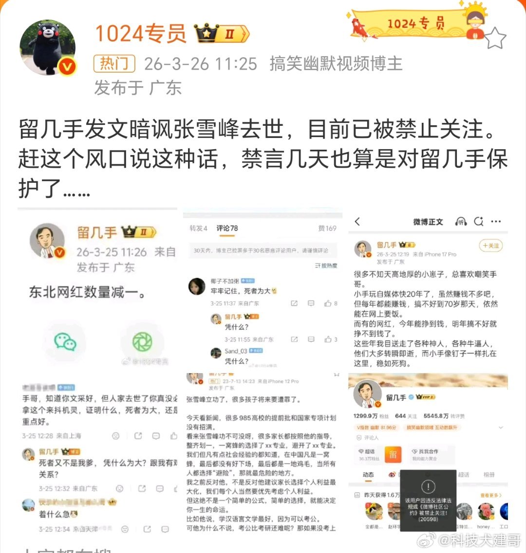 留几手这次翻车翻得彻底。张雪峰老师猝逝,大家都在惋惜,他倒好,发个“东北网红数量减一”阴阳怪气。网友提醒“死者为大”,他直接怼“又不是我爹,凭啥为大?”,这话一出全网都炸了。大家骂他消费逝者、冷漠无情、为了流量脸都不要了,一点没错。最后账号被禁关,纯属自己作的。