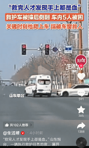 “太了不起了!”山东烟台,一辆执行紧急任务的120救护车被撞侧翻。路人男子不顾手中工作,破窗救出5人后,才发现自己双手都是伤,都是血…… 3月23日上午,一辆正在拉着警笛执行紧急任务的120救护车在通过路口时,被一辆白色私家车从侧面撞击,导致救护车侧翻倒地,车门变形无法打开,而车内有5人,其中一名是需要紧急就医的老人。车内还有一名老人家属,以及2名护士和司机。 就在这危急时刻,正在路过这个地段的顾先生,看到了这一幕,他不顾上手的大量工作和订单,把车停到安全区域后,立马冲过去。冲到侧翻的救护车跟前时,并和其他热心市民分头救人。 他看到此时司机昏迷,比较严重,而且车门根本没有办法打开,这时他爬上侧翻的救护车车顶,进入驾驶室,将车辆熄火,然后用脚顺着前挡风玻璃有些破裂的地方不停踹,破开了挡风玻璃,把司机救了出来。 又立马回到车厢里,和热心市民一起分工,又继续破窗,再次救援了其他4人,并转安全转移4人。 直到后来交警和消防都到后,他这时才松了一口气,低头的时候才发现,自己的手和侧腰以及自己的羽绒服都被玻璃划破。满手都是血。 后来被问到时他说:没有感觉,等到救完人后,才发现自己的手都是血。并表示:看到这个事情,也没有想那么多 ,就想着一心一意救人,把人保证安全 而顾先生因救人也耽误了当天的工作,以及要处理的一些订单,为此,他给客户表达了道歉。 看了评论,有网友说:是救护车的责任?也有网友表示,救护车在执行救急任务的时候,是可以闯红灯的。 其实交通法明确在执行紧急任务的特殊车辆在安全情况下是可以不受信号灯限制的,比如:警车,消防车,救护车,工程救险车… 生活中,真的太需要像顾先生这样的人了,充满了正能量!总是在有危急的时刻出手。平凡的人,做了最了最不平凡的事。 信息来源:生活帮