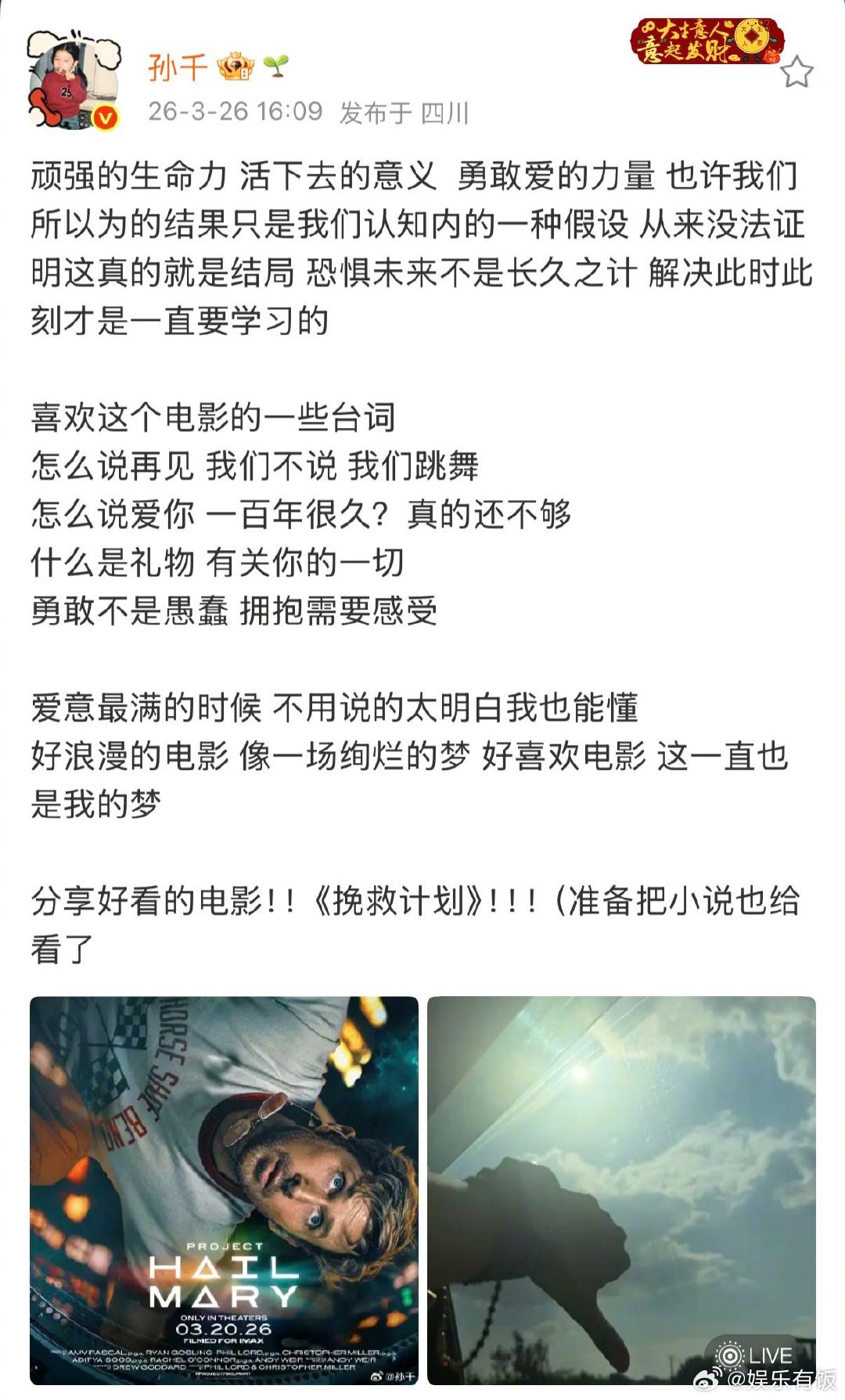 孙千分享挽救计划 孙千准备把挽救计划小说也看了 好鲜活的一个分享自己喜欢的电影的