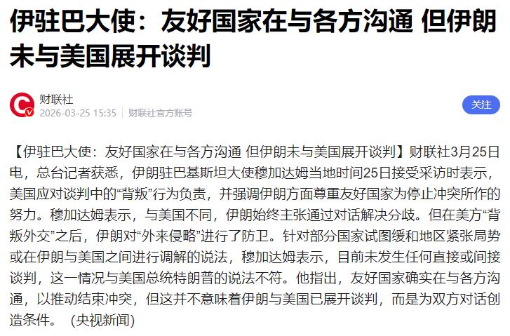 伊朗驻巴基斯坦大使,重大宣布! 当地时间3月24日,特朗普公开宣称美伊已经“取得胜利,伊朗准备达成协议”,与此同时,美国向伊朗抛出15点停火方案的消息也传得沸沸扬扬,不少人被这番说辞混淆视听,误以为美伊双方已经悄悄开启谈判、中东战火即将停歇。 就在这样的舆论氛围下,伊朗驻巴基斯坦大使穆加达姆于25日公开发表重磅声明,用直白且坚定的话语,还原了美伊局势的全部真相,也彻底打破了美国单方面营造的谈判假象。 穆加达姆明确表示,自本轮中东相关冲突爆发以来,美国和伊朗之间,从来没有举行过任何形式的谈判,不管是双方直接面对面的谈判,还是通过第三方开展的间接谈判,通通都不存在。 这一表态直接否定了特朗普的相关言论,也让所谓“美伊即将达成协议”的说法不攻自破,外界此前的种种猜测,全都建立在美国单方面释放的虚假信息之上,并非事实。 伊朗从始至终都希望通过对话化解分歧,这是伊朗一贯的立场,也是中东地区多数国家的共同心愿。毕竟持续的冲突只会让普通民众饱受苦难,地区稳定被彻底打破,和平才是所有人最期盼的结果。 但伊朗的和平意愿,并没有换来美国的真诚对待,反而遭遇了美国多次外交背叛,美国向来是说一套做一套,此前达成的相关共识、给出的承诺,转头就能随意推翻,毫无外交诚信可言。 面对这样的美国,伊朗没有选择妥协退让,而是勇敢扛起保卫国家和人民的责任,坚决抵御外来侵略,守住自己的国家底线,这也是伊朗最无奈却最坚定的选择。 对于和平的可能性,伊朗并没有完全关闭大门。穆加达姆在声明中也提到,巴基斯坦等和伊朗关系友好的国家,一直在积极从中斡旋,努力为伊朗和美国之间的对话搭建基础、创造条件。 而伊朗对于这些友好国家的和平努力,始终持欢迎和认可的态度,也真心希望这些务实的调解行动,能真正推动本轮冲突早日结束,让地区局势重回平稳。 对比美国和伊朗的态度,能清晰感受到极强的反差:美国一边不断对外释放谈判信号,宣称要达成停火协议,营造出想要和平的姿态,一边却没有任何实际的谈判行动,全程只是靠舆论造势,试图主导局势走向;而伊朗始终保持清醒,不被美国的空头承诺迷惑,直白戳破谎言,既表达了对和平的渴望,也亮明了绝不轻信美国的底线。 经过多次外交背叛,伊朗早已看透了美国的行事逻辑,美国的承诺随时可能作废,根本没有任何可信度。伊朗想要的是有保障、有诚信的和平,而不是美国随口一提、随时能推翻的虚假协议。 这也意味着,美国如果真的想推动停火、解决分歧,靠舆论忽悠、单方面造势完全行不通,只有拿出实打实的诚意,尊重伊朗的国家主权,放弃侵略性的施压手段,才有可能让真正的对话落地。 这场重磅声明,不仅理清了当下美伊局势的真实情况,更让外界看清了伊朗的核心立场:渴望和平,但绝不懦弱;愿意对话,但绝不轻信谎言。 美国想要靠谎言操控局势的套路,在伊朗的直白表态面前已经失效,中东局势的走向,终究要靠实打实的诚意,而非空口无凭的承诺。