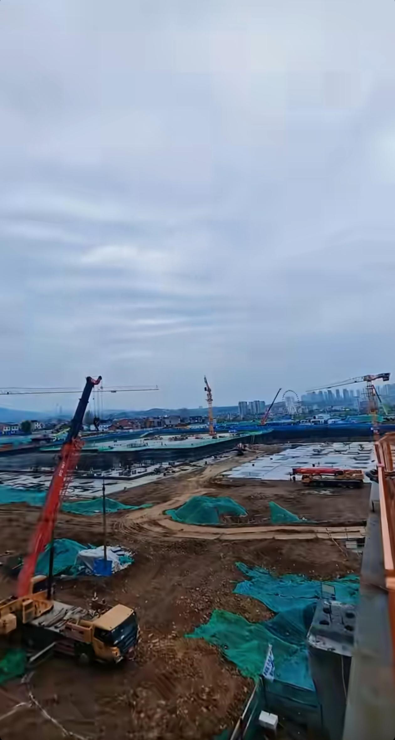 从这个角度看安康西站站房前还有一座高架路,应该是方便车辆送旅客快速下车的吧?站房看着很宏伟,似乎快要完工,但站前广场有不少塔吊和起重机,场地铺满钢筋,看着工程还不小呢,估计下面一层全是停车场。这一块地势真平坦,比普铁安康站好多了,要是安康站地处这样的位置,应该就不会重新选址高铁站了。