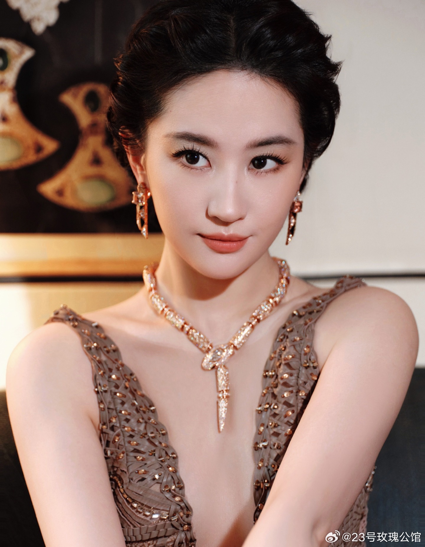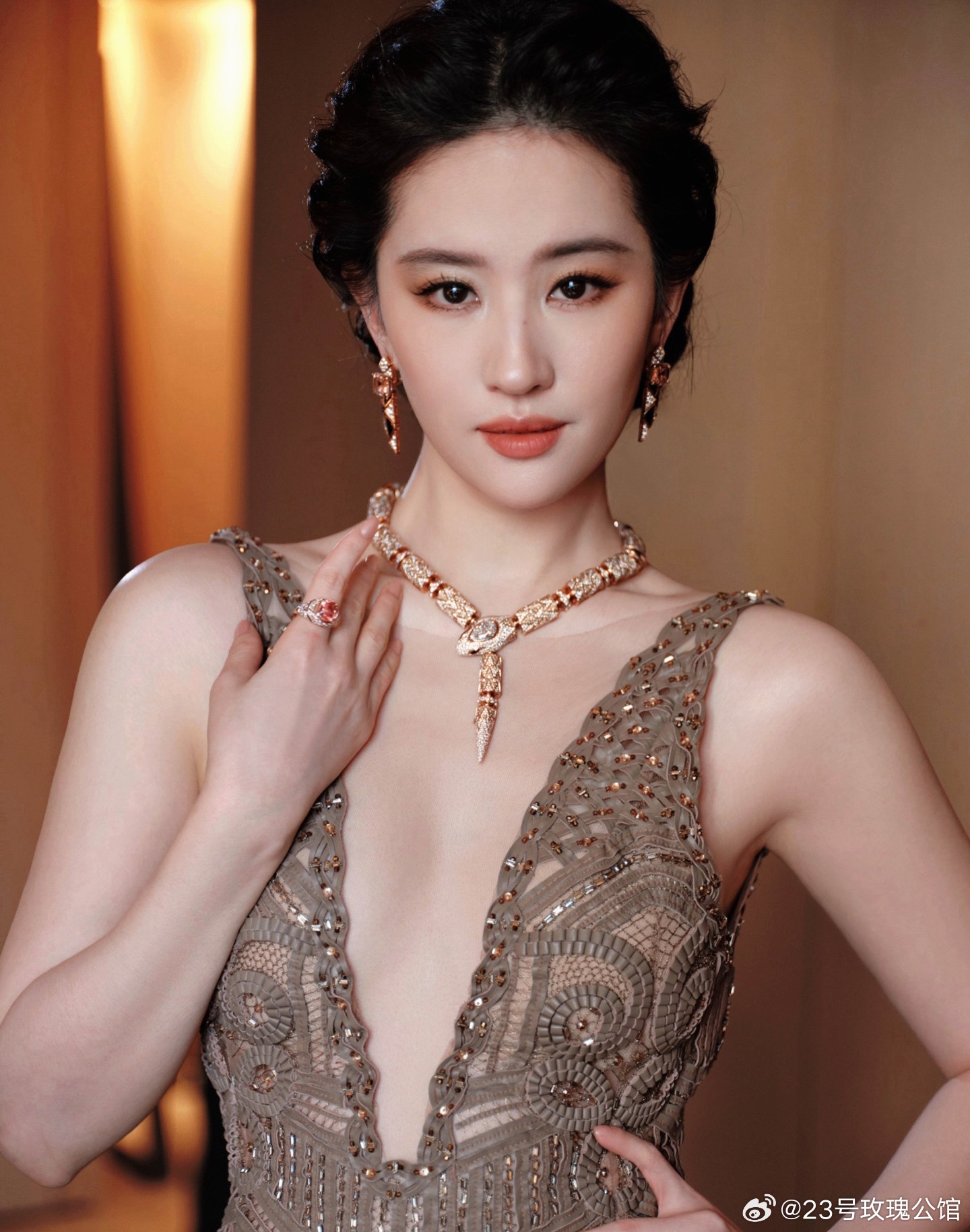 不仔细看还没发现刘亦菲的礼服前面加了一层薄纱,薄纱几乎接近肤色,不影响美观的前提下还能防止肩带下滑。