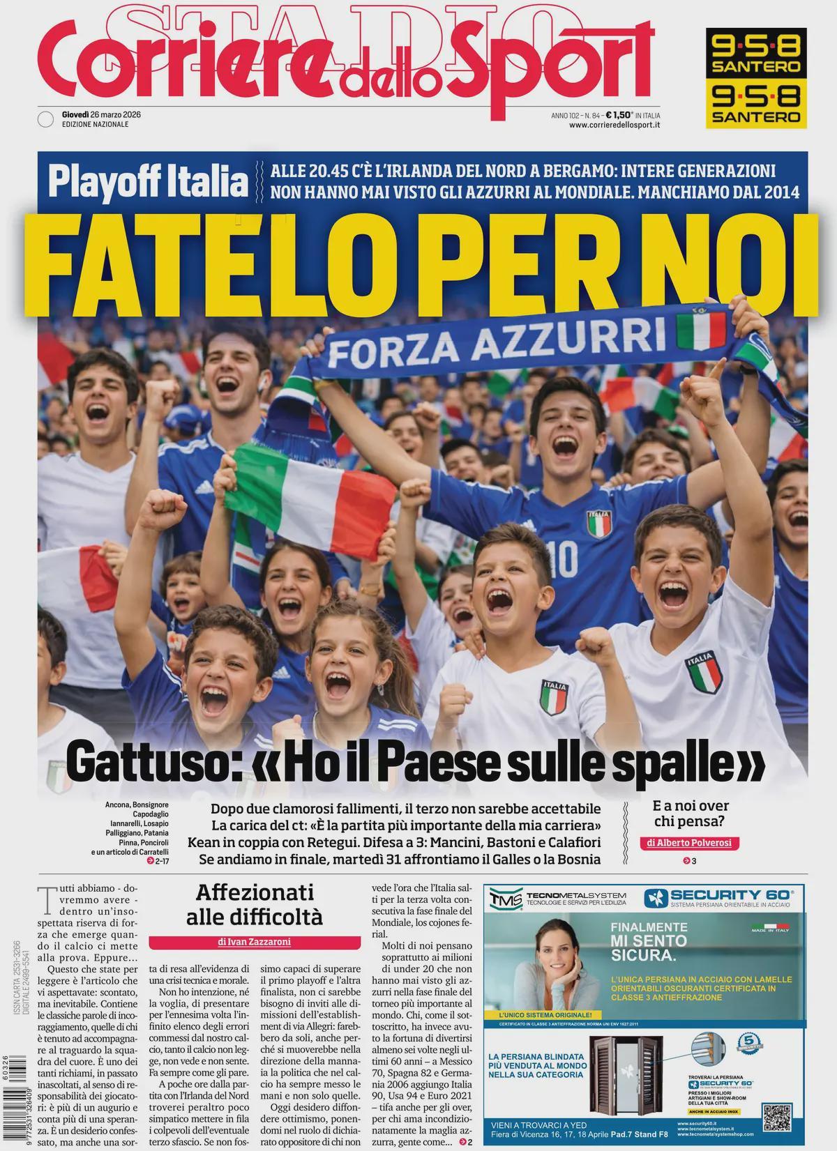 人造意大利意大利《罗马体育报》在国家队与北爱尔兰的比赛前,用头版封面嘲讽了国家队:“封面图片是由人工智能生成的:我们找不到任何像我们一样乐意为国家队加油的年轻人。”