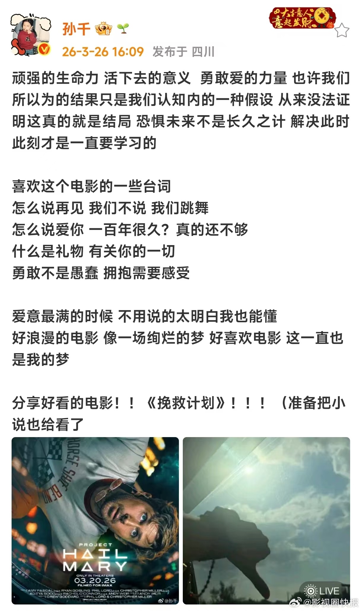 孙千挽救计划给到夯 被孙千分享的挽救计划狠狠打动影片里关于勇气与救赎的表达太动人孤独的个体在星际中寻得希望的故事太戳心 孙千分享挽救计划