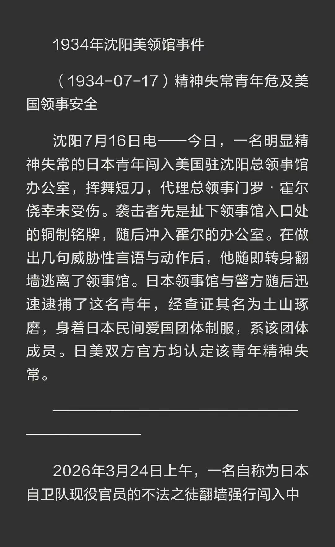 原来,日本人闯馆不是第一次,92年前,就闯过美国领事馆 1934年闯入美国使馆,1941年偷袭珍珠港,间隔7年。2026年闯入中国使馆,那会是7年后偷袭我们?还是可能提前? 还有1891年,俄国沙皇尼古拉二世,还是皇太子的时候,在日本游玩就被砍,后面日俄战争爆发…… 所以,特朗普都说了日本最擅长偷袭,必须做好防护准备。