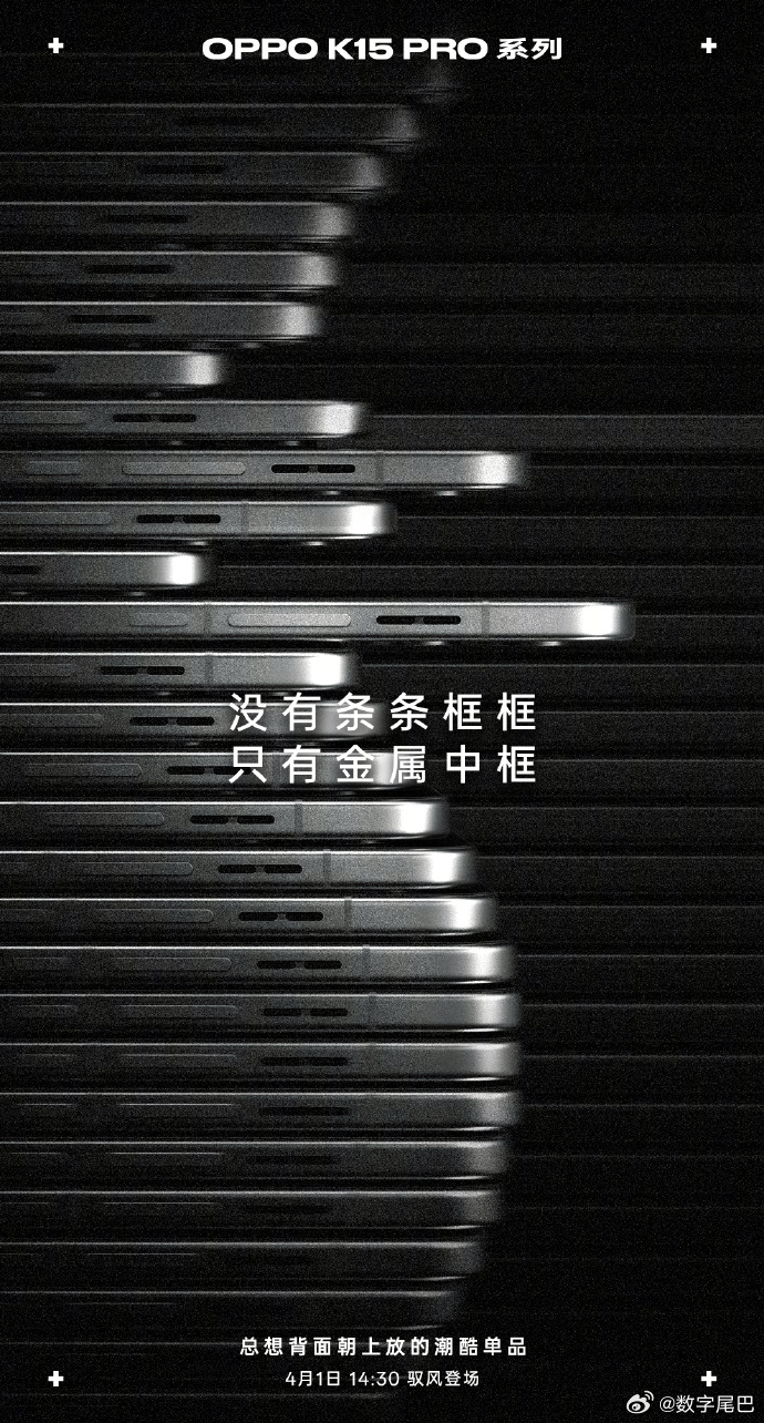 OPPO K15 Pro 这两天开始预热了,整个海报和氛围都是酷炫风格,今天的海报里文案写着「没有条条框框,只有 金属中框」