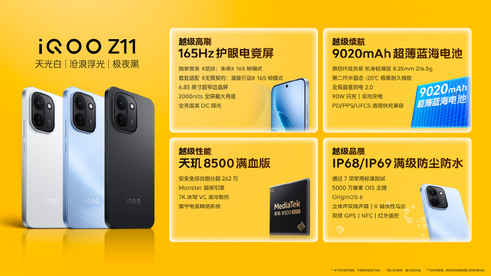 iQOO Z11 搭载天玑8500满血版芯片,安兔兔跑分262万,6.83英寸165Hz OLED屏,IP68/IP69防尘防水,9020mAh电池,90W闪充,5000万像素OIS主摄。价格方面:8+256GB 199912+256GB 229916+256GB 259912+512GB 279916+512GB 3199(以上均为首销优惠价,不含国补)