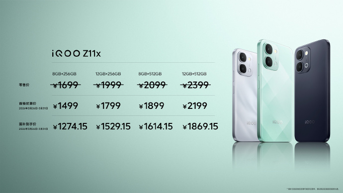 iQOO Z11x 搭载天玑7400芯片,6.76英寸LCD屏幕,7200mAh电池,44W闪充,IP68/IP69防尘防水。价格方面:8+256GB 149912+256GB 17998+512GB 189912+512GB 2199(以上均为首销优惠价,不含国补)
