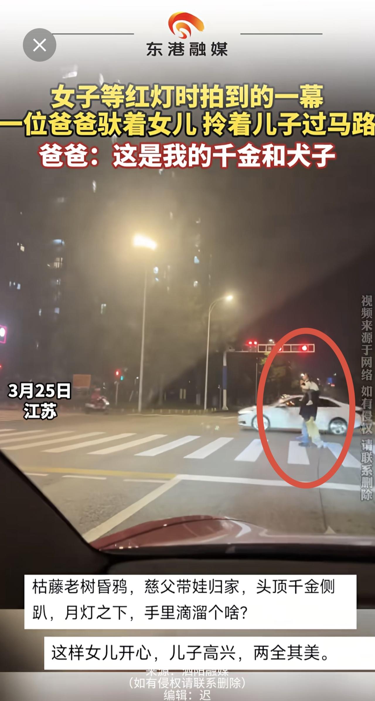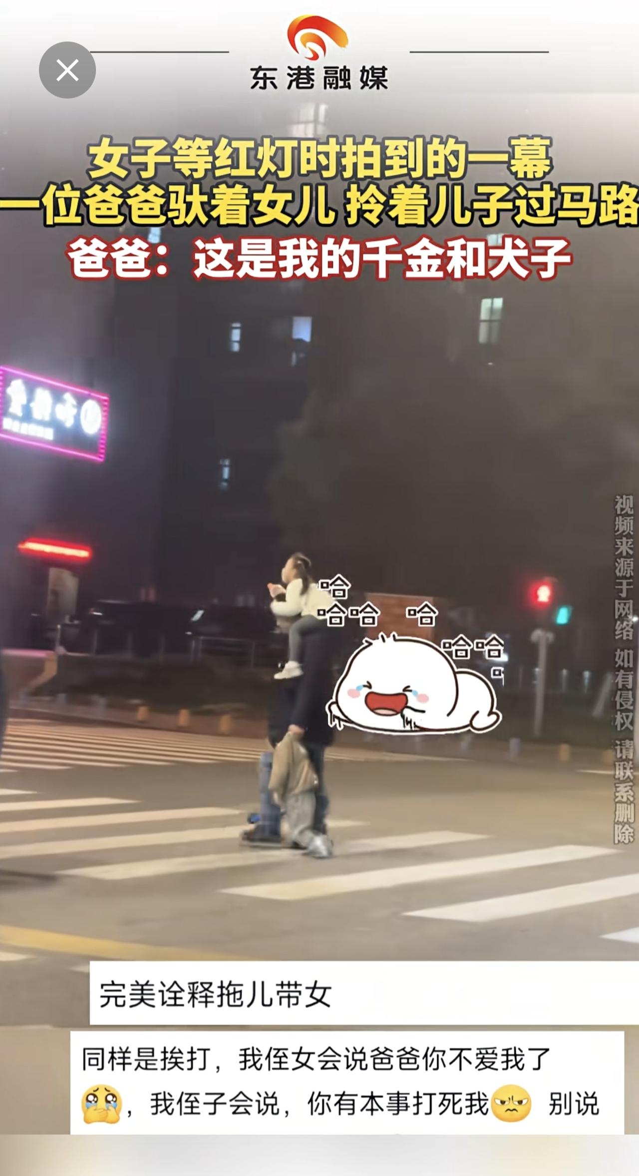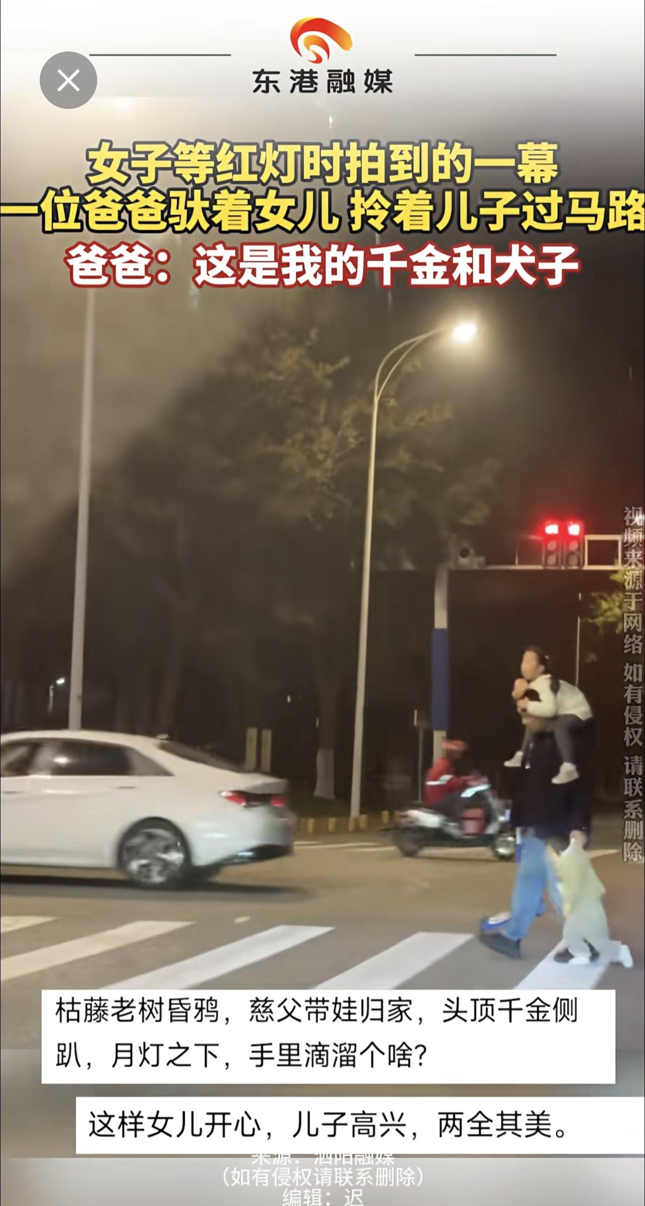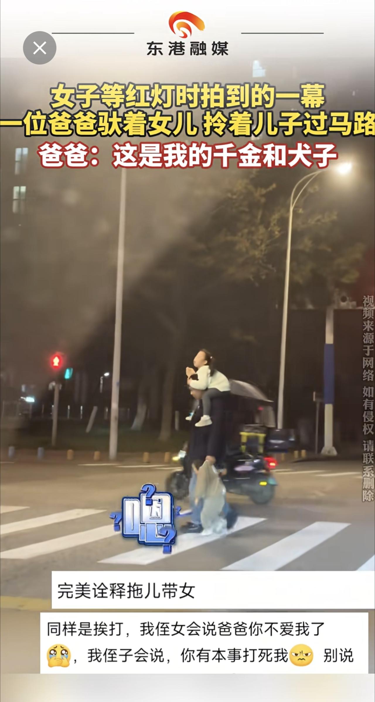 女子等红灯时拍到的一幕 一位爸爸驮着女儿 拎着儿子过马路 爸爸:这是我的千金和犬子(来源:泗阳融媒 编辑:迟)