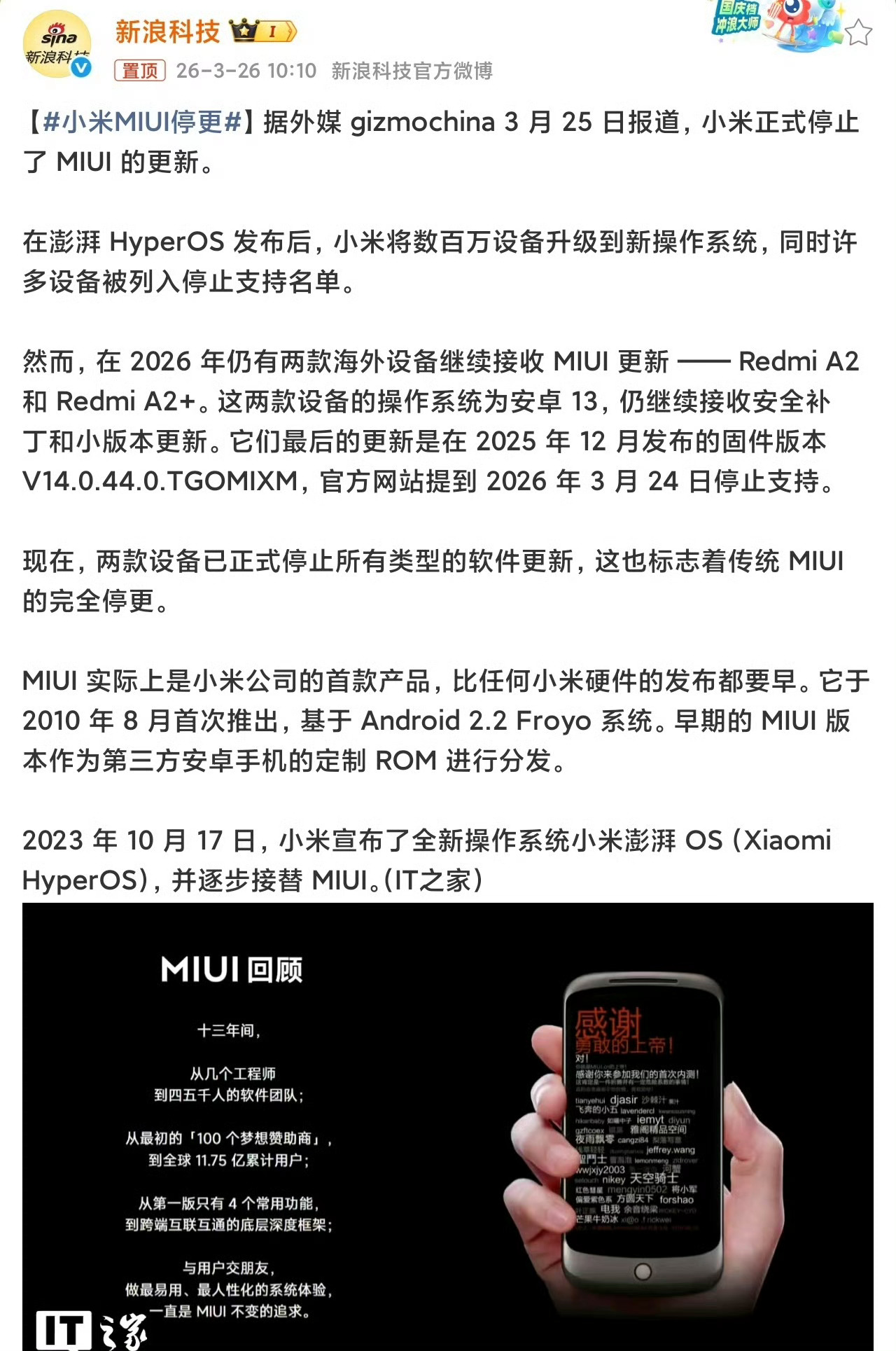 小米MIUI停更哎呀!伤感,可以说是划时代的产品了,也是小米梦开始的地方。当年大部分都是原生安卓,并不好用,MIUI 在当时我认为就是懂中国人的手机 ROM。