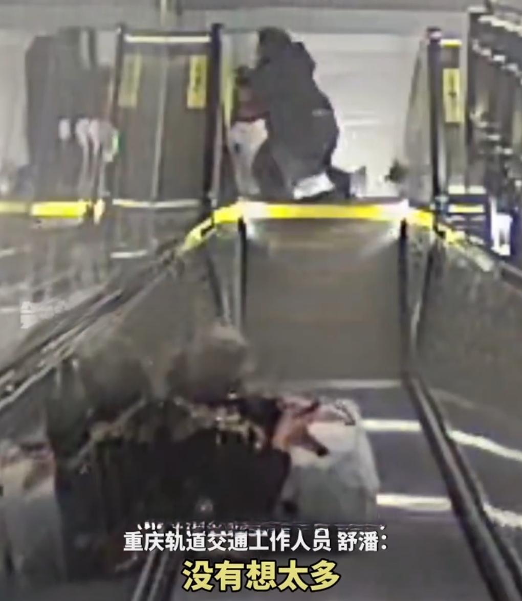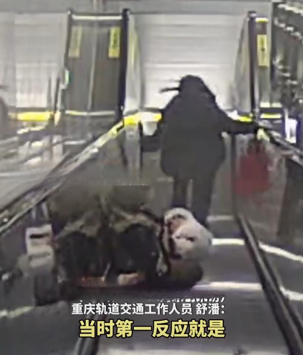 2026年3月26日,重庆轨道交通,一名工作人员在上班途中遇到了突发情况。 上午8点多,在红土地站进站扶梯口,一位婆婆提着菜篮子踏上扶梯。她没站稳,身体往后仰,眼看就要倒下。 当时,轨道交通工作人员舒藩正好从旁边经过。他事后回忆:“我余光扫到有人晃了一下,回头一看,老太太已经往后倒了。” 她飞奔而下,连滚带爬冲到扶梯口按扭边,按下扶梯急停按钮,同时伸手托住老人的后背。 扶梯停了。婆婆被稳稳扶住。 “婆婆,您没事吧?”舒藩问。 婆婆愣了愣神,说:“我……我没事,就是脚滑了一下。” 旁边的乘客也围过来。有人说:“女士,反应真快。” 舒藩检查了一下婆婆的情况,确认没有受伤。她把行李箱扶起来递给婆婆:“您小心点,要扶好扶好扶手。” 婆婆点点头:“谢谢你啊,美女,要不是你,我今天就摔惨了。” 舒藩笑着说:“应该的,您慢走。” 整个过程不到10秒。 站内的监控拍下了这一幕。画面里,舒藩从起步到按停扶梯,动作连贯,没有犹豫。 视频后来被传到网上,多家媒体转发,镜头被称为“超帅瞬间”。 舒藩看到视频后说:“哪有什么帅不帅的,看到了就得上。”重庆地铁导视