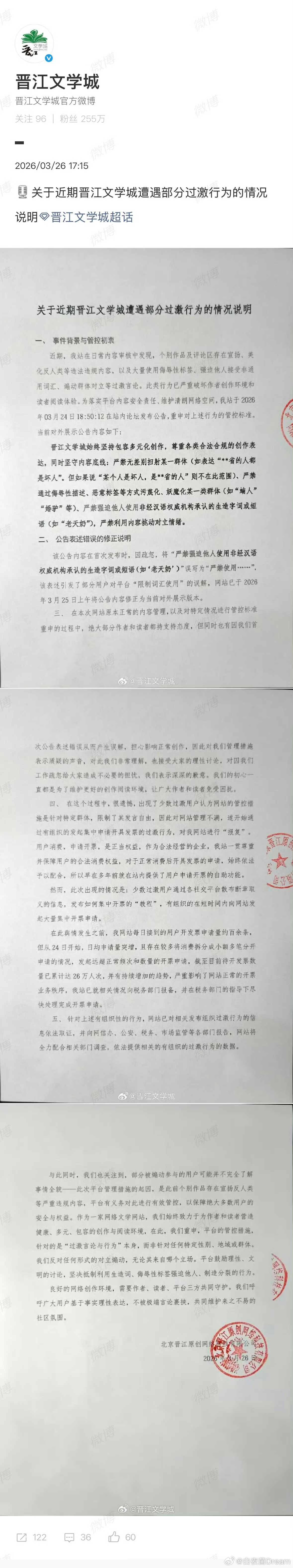 晋江发情况说明晋江文学发情况说明了。同时还在评论区开启了评论精选。