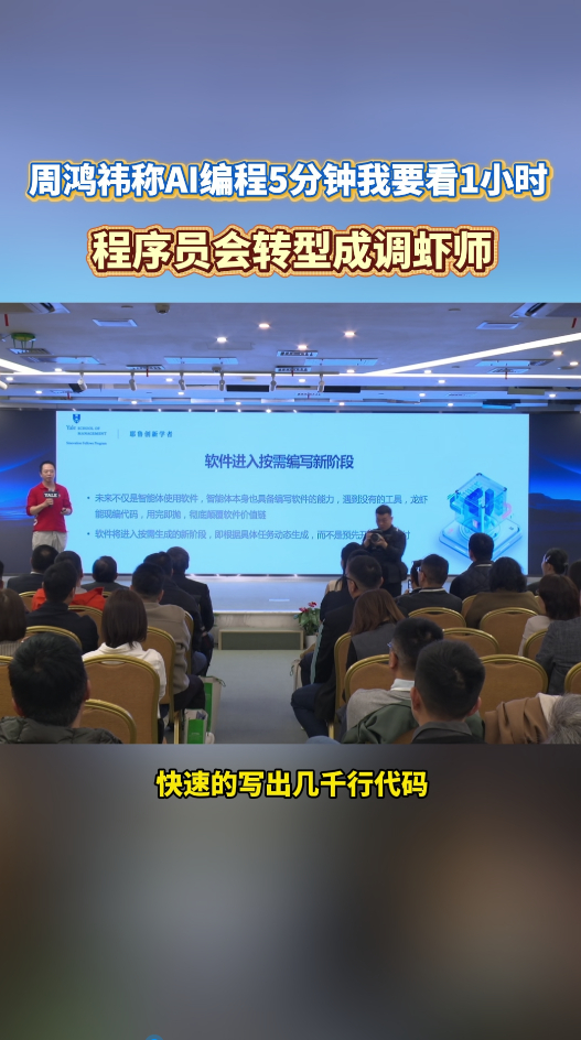 周鸿祎称AI编程5分钟我要看1小时AI降低了编程的入门门槛,但也抬高了人才标准,未来只有懂业务、会驾驭AI的人,才能在行业里保持竞争力。周鸿祎称程序员会转型成调虾师