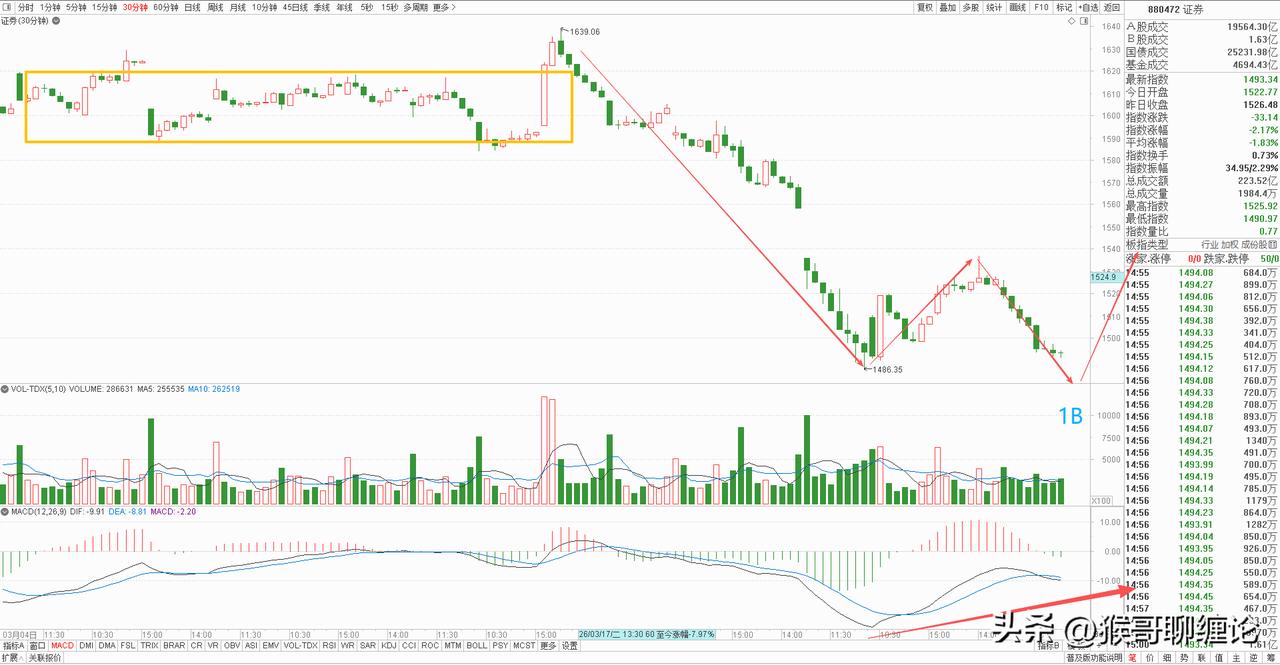 券商板块今天低开低走,缩量下跌,伴随市场节奏运行,也没有出来护盘,这个时候随着调整是最好不过,强行护盘只会积累更多的风险,毕竟持续缩量已经存在很大的隐患,及时调整反而是好事。 从30分钟图上看,这里已经开始向下一笔的回调,而且已经摸到前低附近,只要明天破了前低,就会出现强有力的背驰买点,从而引发更大力度的反弹,所以明天早盘向下是机会,不要过度恐慌。