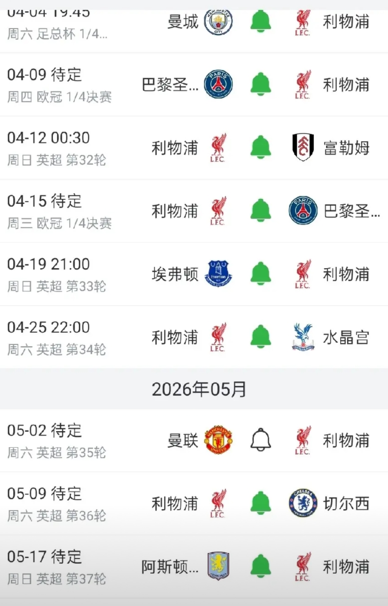 1.第32轮:利物浦VS富勒姆(英超第9)