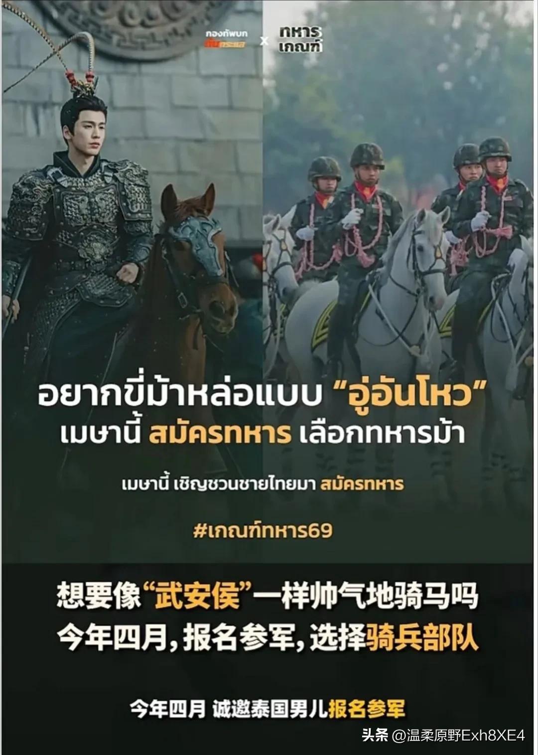 妈呀,笑不活了!真是国情不一样,那连招兵方式都完全不同! 《逐玉》火到了泰国,泰国官方直接把张凌赫的武安侯剧照搬上征兵海报,并配文:“想要像‘武安侯’一样帅气地骑马吗?今年四月,报名参军,选择骑兵部队。” 在国内,由于张凌赫剧中形象过于粉嫩,还被有些网友戏称之为“粉底液将军”,批判声不断!结果到了泰国,这些反而成了优点[what] 很难想象,如果国内招兵,这样宣传,那部队的领导会怎么收拾宣传部的文员[偷笑]?不说新兵,老兵都寒颤跑了吧?血性这个东西,某些国家可能是真没有?