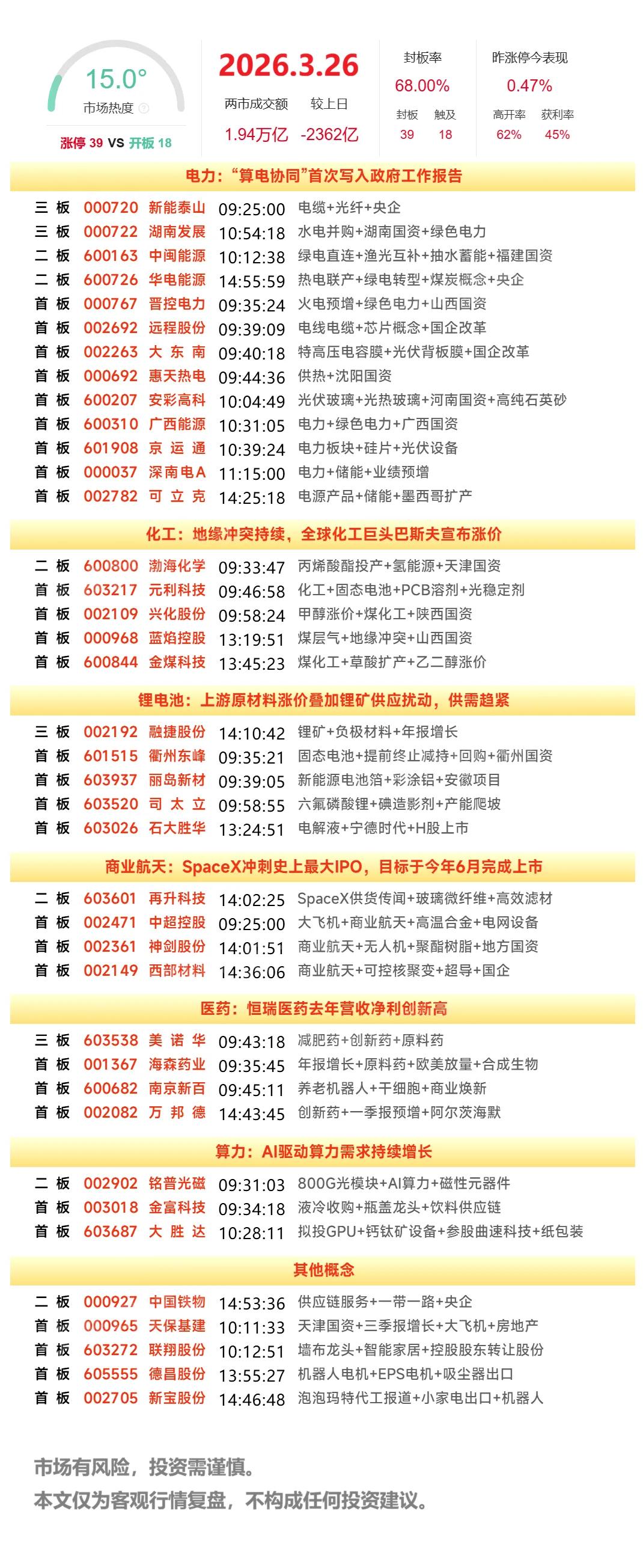 3月26日复盘:华电辽能、华电能源、中闽能源隔日走势的一些看法! 1、华电辽能(绿电) 华辽今天早盘竞价高开7个多点的表现是非常强势的,所以开盘是有资金承接拉升,但是整个绿电是明显大分歧的,华辽无法封板的情况下出现了明显资金抢跑,但是整体承接非常强,放出足够量能后出现资金去触板,但是明显不坚决,磨蹭了半个小时后才彻底封板,午后在情绪影响下再次炸板,虽然有承接回封,但是收盘最后时刻出现资金砸盘,最终还是断板收场! 盘后的龙虎榜是3日榜,买盘接力的多为量化,卖盘为近期获利盘离场,值得一提的是20日5板介入的申港四川分和东亚前海苏州分并没有出现在卖盘榜,继续格局的概率很大,这样的话辽能这个榜单并不算太差,从情绪上看,这种尾盘砸盘的行为确实挺恶心的,毕竟今天华辽前期的换手已经很充分,如果不是这种尾盘偷袭,大概率会有资金承接回封,那么这样的尾盘砸盘大概率就是明显的主力行为了,如果今天涨停,华辽是直接继续触发两个严重异动的,一个是今天触发了的10个交易日4次普通异动,另一个则是30个交易日200%偏离值,这个因为尾盘的砸盘没有触发,从情绪上看,如果今天直接触发两个严重异动的话,很可能盘后就是停牌预警了,而今天盘后确实没有相应的消息面,稍微大的利空就是有提到不涉及算电协同,但是说实话这种提及更多的还是看资金的态度,如果资金认可,隔日就不会有太大的负反馈,反之,如果当成一个利空消化,就会影响非常大,从情绪上看,隔日华辽开盘的表现就非常关键了,毕竟近期只要走出过7板高度的个股就很难A杀,更何况华辽是市场最强势的绿电方向个股,所以隔日依然会是资金博弈的机会,毕竟今天虽然绿电整体回调,但是后排还是有不少新面孔的,相比与算力和智能电网,绿电的接力确实是源源不断,那么一旦隔日板块情绪修复,华辽可能真的不会太难看,如果要去模仿合富、豫能,那么竞价的表现就不能太差,总得来说,隔日华辽竞价的表现还是挺关键的,只要不出现大幅低开的负反馈,走出冲高修复的概率还是很大的,毕竟今天另一个强势高位票华能尾盘封板了,如果它能坚挺,对于华辽的修复肯定有促进,这两只个股还有一个共同点,隔日如果大涨都会触发30个交易日200%严重异动,资金如何选择就非常有看点了,所以对于华辽来说,不用看空,也不用过于担心,隔日早盘市场的选择非常关键,至少从今天的表现看,华辽是不可能一字跌停的! 2、华电能源(绿电) 华能一直是市场上非常强势的绿电趋势股,作为之前绿电方向的龙头,华能断板后整体趋势依然不变,今天之前日线上已经是22连阳了,早盘小幅高开拉升后迅速回落,如果结合华辽的走势看,全天跟随华辽非常明显,尾盘最后阶段出现资金承接封板,并且最终封死涨停,走出了一个高位的连板表现! 盘后的龙虎榜买盘沪股通买入1亿,庆春路做T,量化接力引导,这个榜单是明显的外资做多接力,引起了市场资金合力去封板,因为它是尾盘才强行上板,最终反而没有受到华辽炸板影响,不过华能隔日同样有30个交易日200%的严重异动,它之前10个交易日100%是正好在最后时间控盘卡了异动的,从情绪上看,隔日去主动挑战的概率不高,毕竟它今天尾盘的封板也是比较弱的,但是它毕竟最终涨停了,隔日得表现就很可能是绿电整体的风向标,一旦它开盘强势,对于整个板块会有带动作用,所以它和华辽是可以结合在一起看的,算电协同方向至今没有3倍股,它们两个是涨幅最大的,如果整个算电协同持续性比较强,它们肯定会还有反复,而华能的23连阳明天能否继续同样是非常大的看点,但是如果它竞价就有明显负反馈,那么整个绿电方向可能就不妙了,特别是它和华辽双杀的情况下! 3、中闽能源(绿电) 昨天尾盘福建方向走出板块效应,立马把中闽推到了一个非常高的高度,所以它竞价是整个绿电方向最强的,但是今天板块强分歧,再加上福建方向同样不给力,中闽盘中也是出现了一次明显资金抢跑分歧炸板,但是它的承接非常强,很快有资金硬顶封死涨停,走出了一个比较强势的换手T字板晋级! 盘后的龙虎榜是3日榜,太华路的6千万非常显眼,上海松林路入场接力,这个榜单整体并不差,游资和量化结合的榜单,中闽能在今天板块分歧的情况下特别强势,更多的是昨天尾盘福建题材的带动,它天然的成为今天资金接力绿电方向的首选,在板块分歧时出现炸板放量并不一定是坏事,隔日它能否再次有超强表现是绿电修复一个非常重要的风向标,一旦它竞价超强,整个绿电或许会有明显修复,反之,一旦它竞价偏弱,那么绿电整体可能依然会是分歧的一天,那么资金会不会选择做明显的高低切就非常有看点了,总得来说,这只个股隔日或许有不错的接力点,但是最好是出现在开盘就启动! 今天几只核心绿电个股讲的有点多,篇幅有限,再升为龙头的商业航天就不说了,明天早盘预案会重点提到!