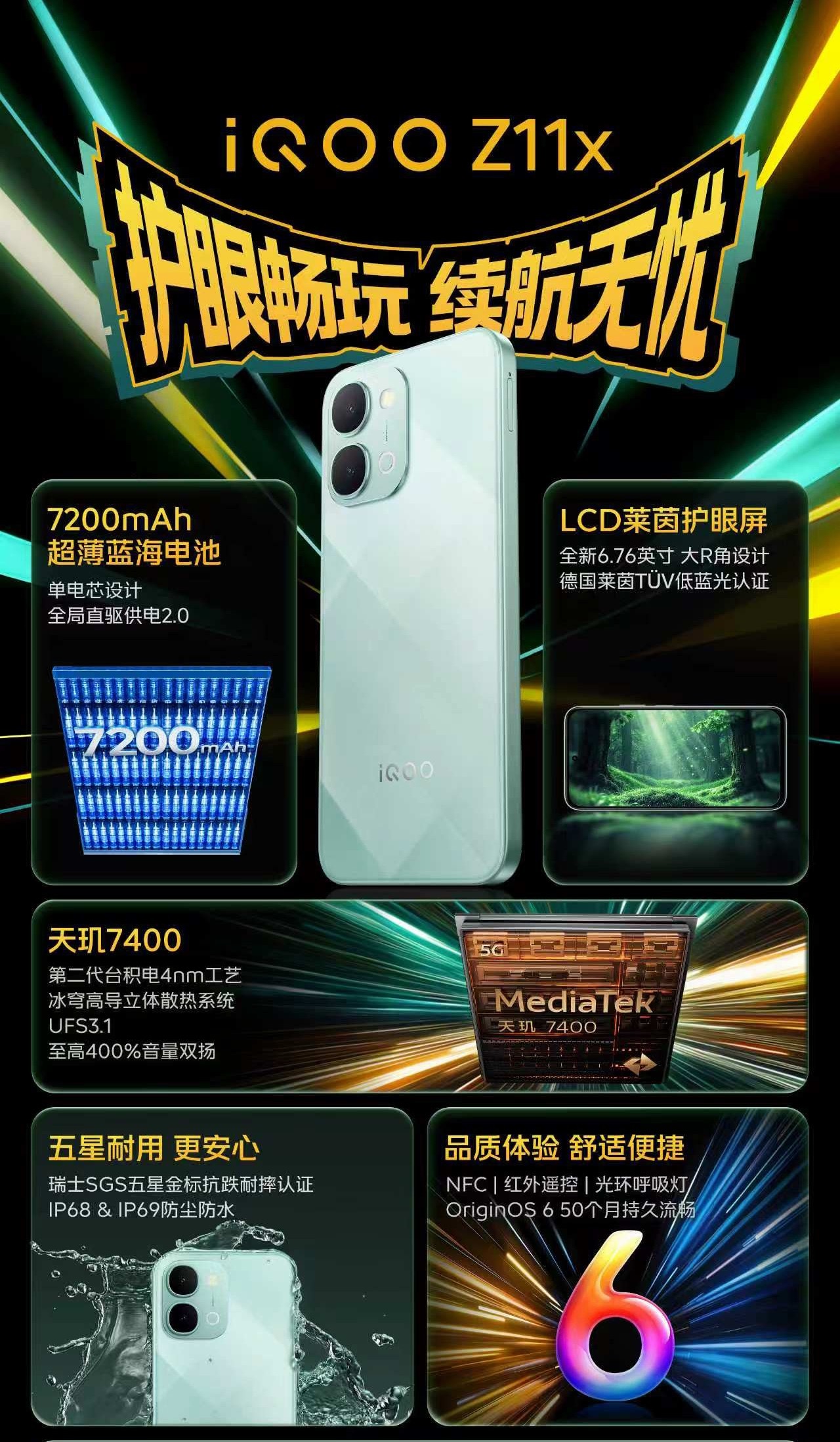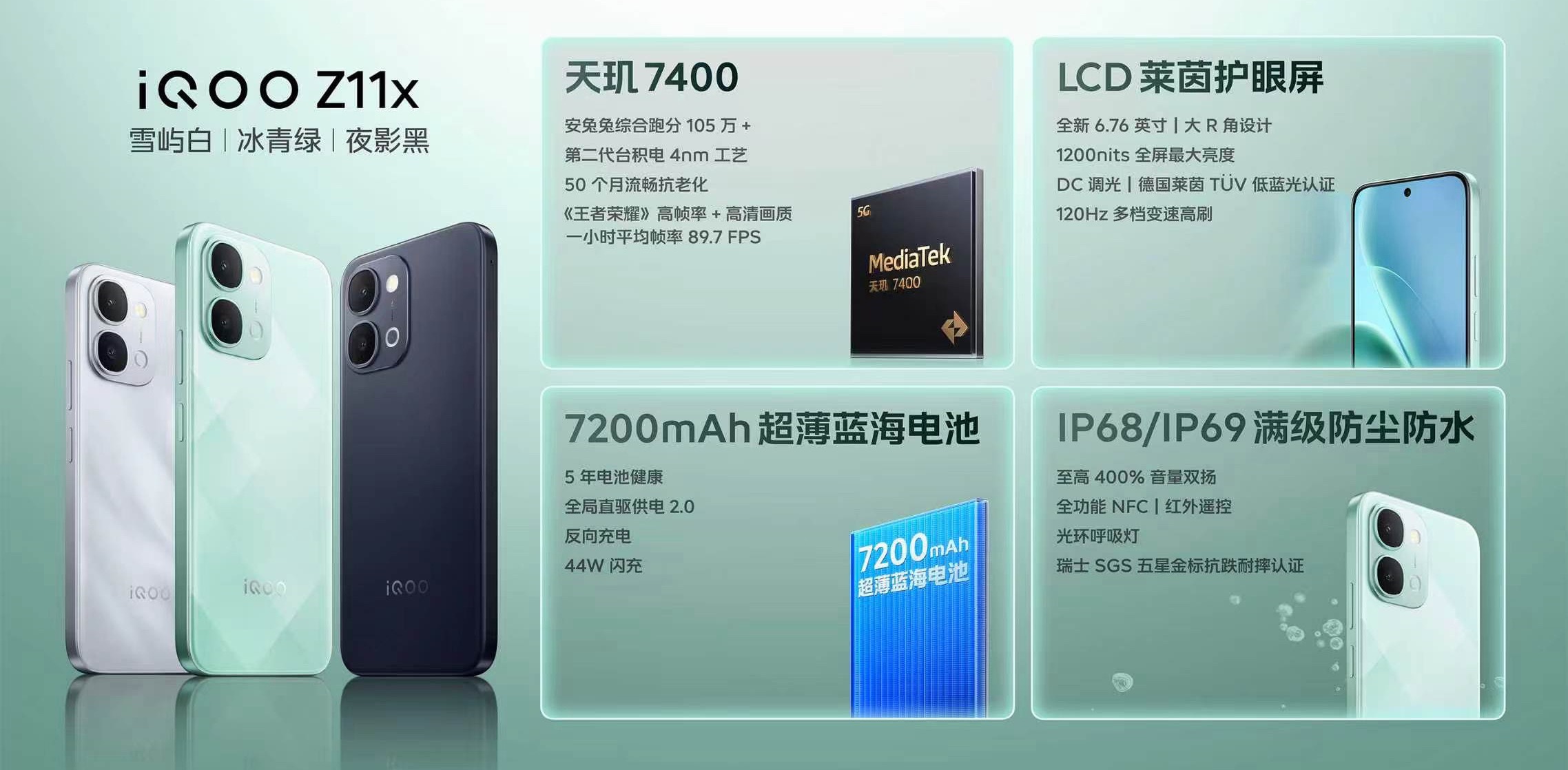 这次还有一台 iQOO Z11x,LCD护眼续航党首选,搭载天玑7400,第二代台积电4nm工艺,《王者荣耀》高清画质高帧率可达89.7帧。