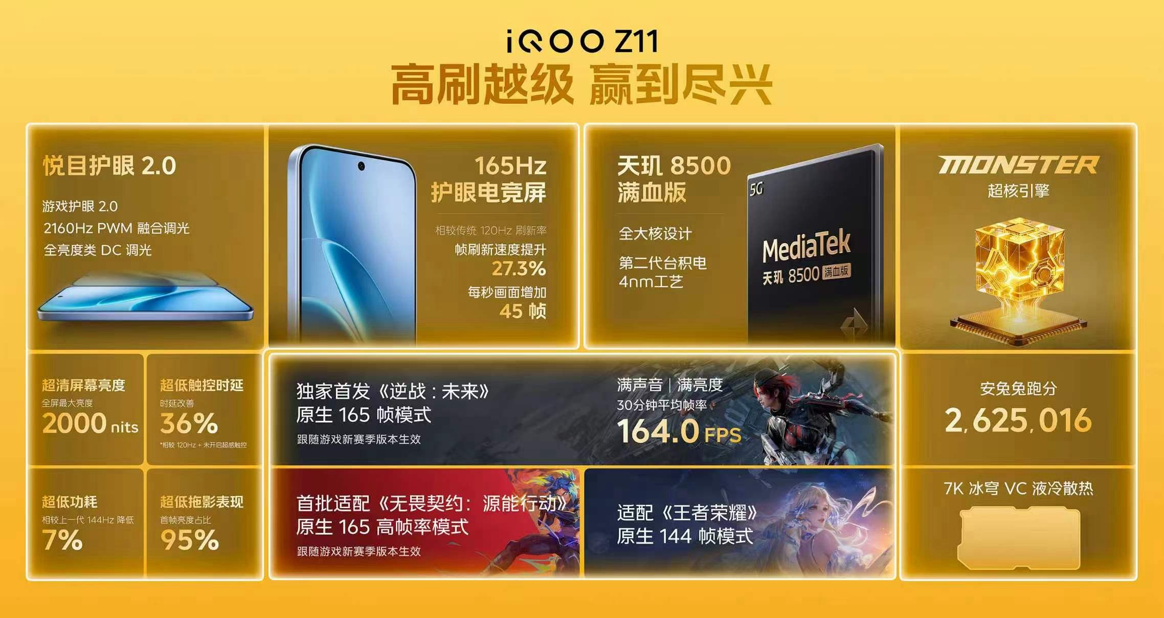 首当其中的就是iQOO Z11,搭载天玑8500满血版,第二代台积电4nm工艺,Monster超核引擎加持,游戏帧率拉满。6.83英寸165Hz护眼电竞直屏,2000nits峰值亮度+2160Hz高频PWM调光,支持多款游戏165帧模式还有9020mAh超薄蓝海电池,90W闪充+反向充电,重度党福音。