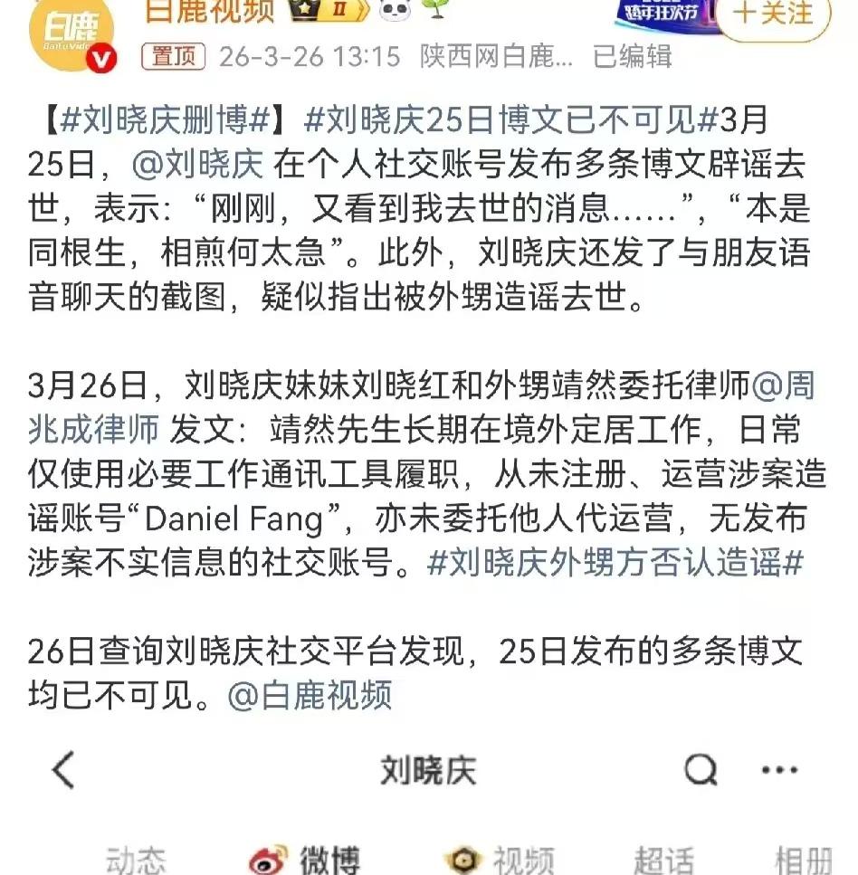 刘晓庆火速删文!指控外甥造谣后,24小时紧急撤回 3月25日,75岁的刘晓庆连发三条微博,怒斥“死于横店游泳池”的谣言,并直指造谣者是亲外甥靖然——“本是同根生,相煎何太急”。 不到24小时,三条博文全部删除。 事情要从3月24日说起。境外账号“Daniel Fang”发布刘晓庆死讯,捆绑蔡澜去世增加可信度。刘晓庆次日连发三条辟谣:晒工作照证活,晒截图质问“为什么盼着我死”,晒微信记录指控外甥靖然是造谣者,还控诉其“举报别墅违建”。 网友炸了:一手抚养长大的亲外甥,为什么要害她? 反转来得很快。3月26日,刘晓庆妹妹刘晓红与外甥靖然委托律师发布声明:经技术核查,靖然与造谣账号无任何关联,否认所有指控,要求刘晓庆“以亲情为重,理清真相”。 当天中午,刘晓庆悄悄删除了全部相关博文。 删文原因众说纷纭。律师声明提供了IP地址、设备信息等技术证据,证明靖然与账号无关;刘晓庆若继续指控,可能面临诽谤诉讼。更深层的矛盾是:2025年底,刘晓庆宣布将全部财产捐赠给中国电影基金会,亲属无权继承。40年亲情,在巨额财富面前不堪一击。 网友分成三派。支持刘晓庆:一手抚养长大还反咬一口,太心寒。支持靖然:没实锤就公开点名,太不负责任。中立派:40年亲情不该毁于网络。 从“杀人预告”到“怒斥外甥”,再到“紧急删文”——不到24小时,刘晓庆用删文结束了这场家庭闹剧。只是那条“本是同根生”的控诉,还留在无数网友的截图里。