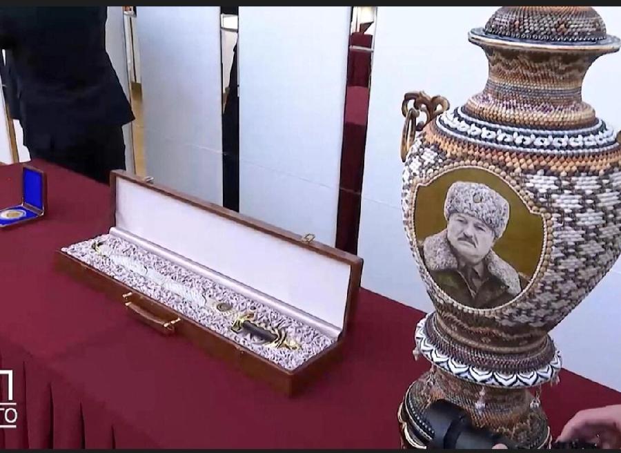 金正恩与卢卡申科互相赠送礼物。卢卡申科送给金正恩一把自动突击步枪,金正恩回赠卢卡申科三样东西,一把佩剑、一个纪念此次访问的金币,一个印有卢卡申科头像,朝鲜传统贝壳工艺制作的大花瓶,金正恩现场操作试枪,卢卡申哥还笑着说送枪目的,防止万一有敌人呢?金正恩听了哈哈大笑!卢卡申科,这是啥意思?