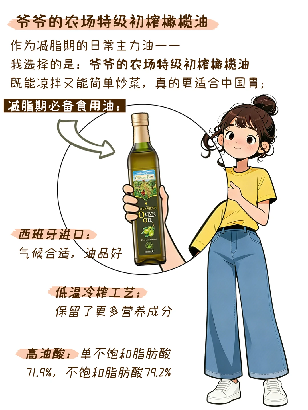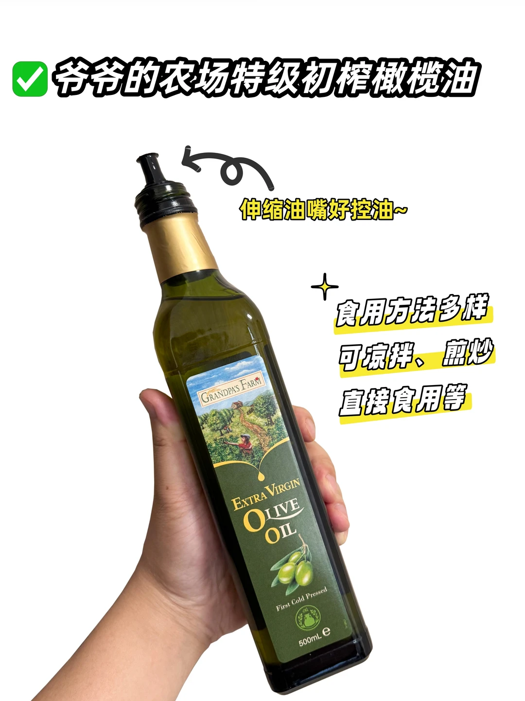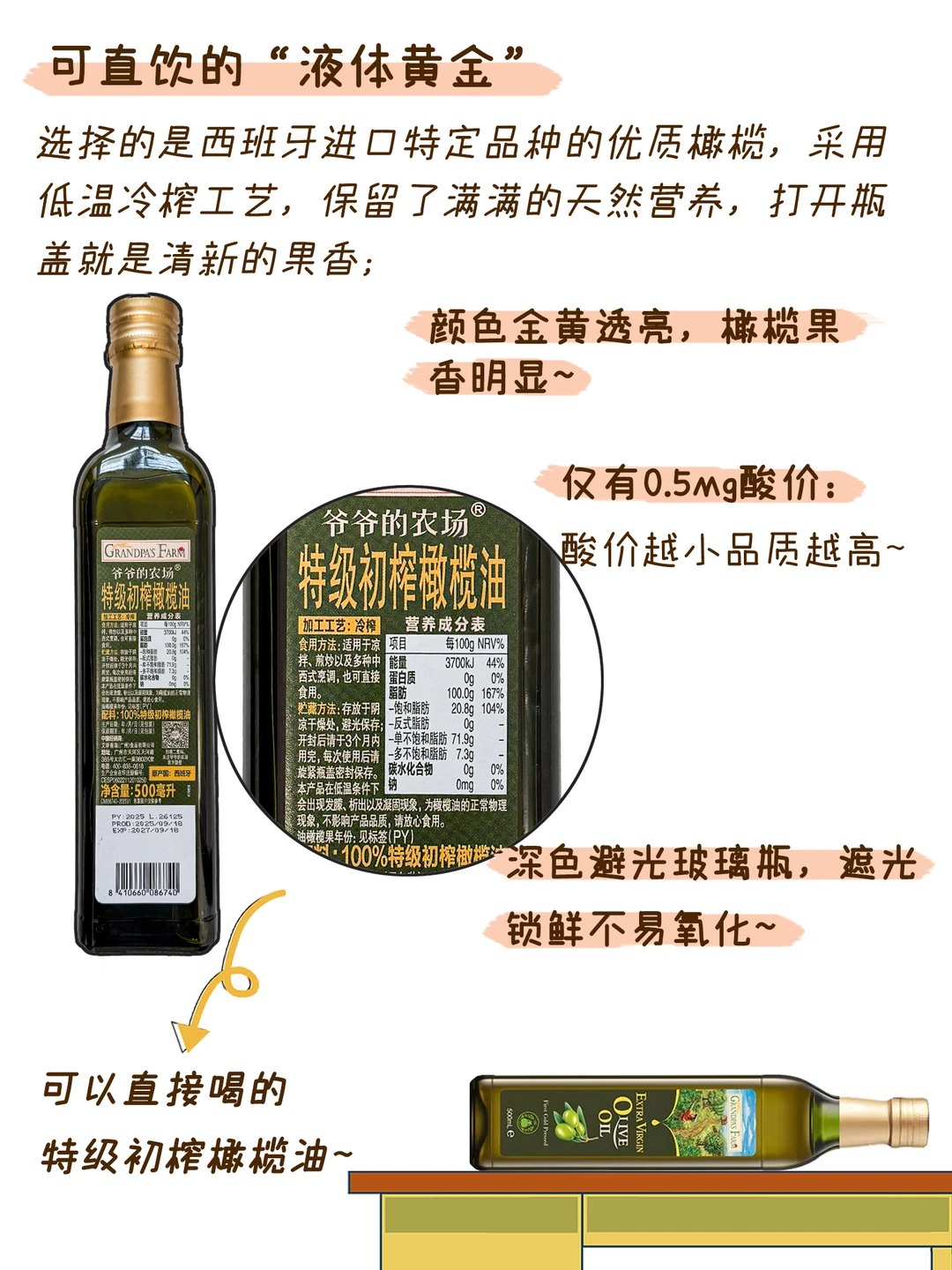 ✅ 选择的是西班牙进口特定品种的优质橄榄,采用低温冷榨工艺,保留了更多营养
