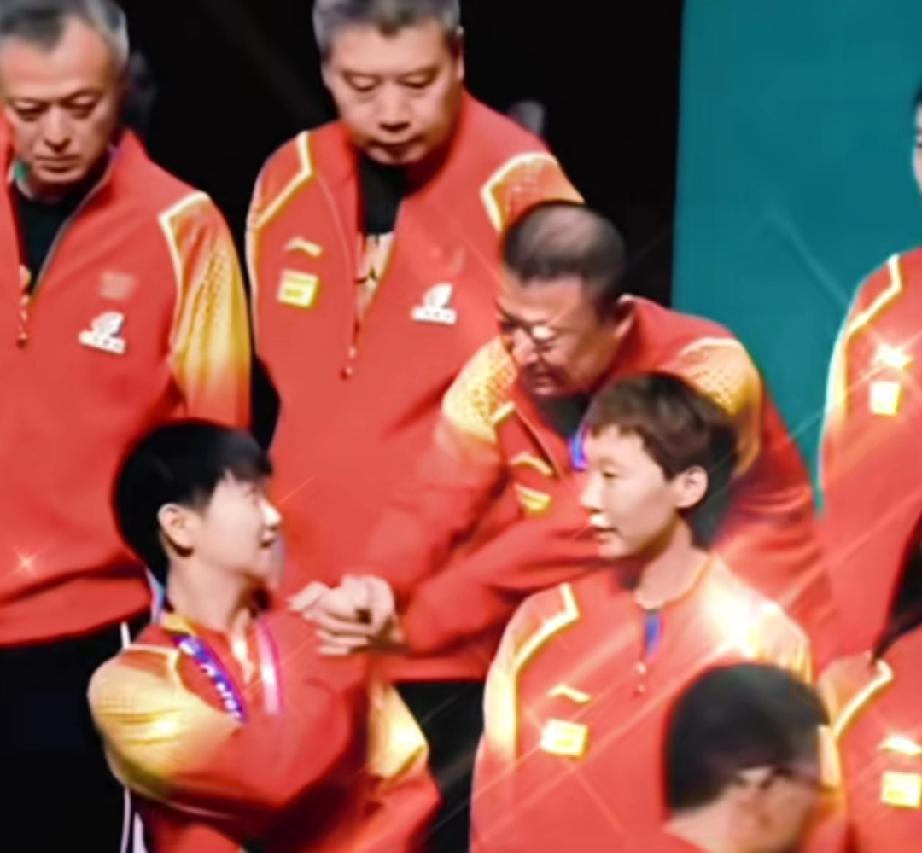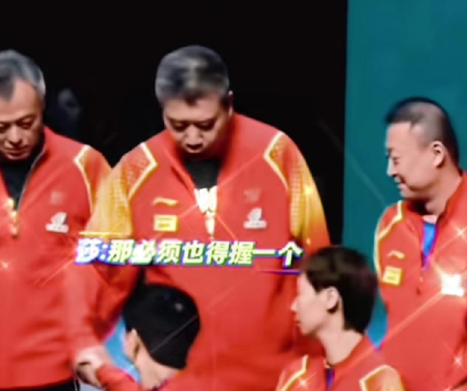 马琳站在莎莎斜后方,忍不住手搭在莎莎肩膀上,摇晃两下,满眼的欣赏。莎莎回头后,伸手和马琳击掌。 后面李隼爷爷站的笔直,也很想击掌,莎莎左右回头笑笑看到了李隼,赶紧伸手握手,还不忘和李指旁边的秦志戬握手,真是面面俱到。这样的莎莎谁不喜欢呢?大方明媚!