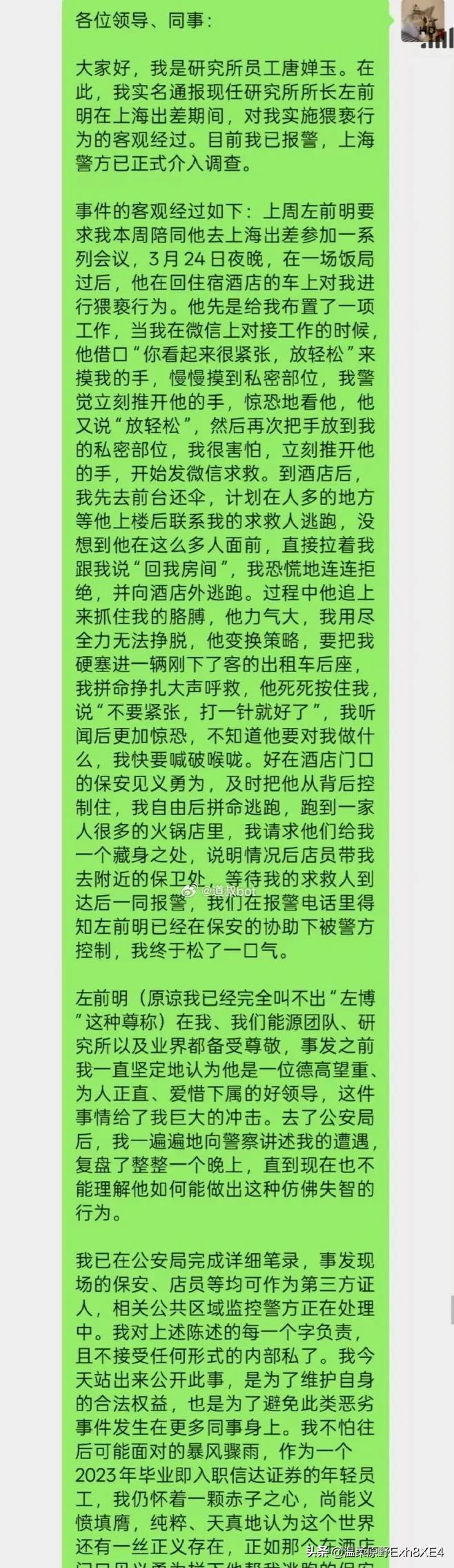 研究所所长被刑拘这事,告诉我们:女子被猥亵,只要敢硬刚,即使金融大佬也能拉下马! 这所长胆子太大了,被下属女子明确拒绝,还敢光天化日之下接连三次动手。 第一次,饭局过后,在回酒店的车上。大佬借口布置工作,手却慢慢摸到女子私密部位,女子警觉立刻推开;可大佬依然不死心,又一次摸过来,女子再次推开,并发微信求救。 第二次,到酒店后,女子先去前台还伞,计划在人多的地方联系朋友逃跑。可谁知大佬当着那么多人面前,也敢直接拉着女子说“回我房间”。女子恐慌,向酒店外跑去。 第三次,逃跑过程中,大佬追上并抓住女子的胳膊,然后变换了策略,要将女子硬塞进一辆刚下了客的出租车后座,还对女子说:“不要紧张,打一针就好了”。 好在女子一直大声呼救,酒店保安看的确不对劲,才好心赶忙控制住大佬。 目前,大佬因涉嫌强制猥亵罪,已被刑事拘留。 据悉,左大佬,42岁,是一家500亿巨头的证券研究所所长。这样的人要名利有名利,要权力也能有点权力,可为啥偏偏非得自己往牢里钻呢? 就连受害女子也表示,左大佬在研究所以及业界都备受尊敬,事发之前,一直认为他是一位德高望重、为人正直得好领导。怎么 都不理解他为何能做出这种仿佛失智的行为。 网友:太猖狂了,肯定不是第一次!面对这样的臭虫,妥协只会让他变本加厉,必须狠狠给他教训,他才会本分! (信源:九派新闻)