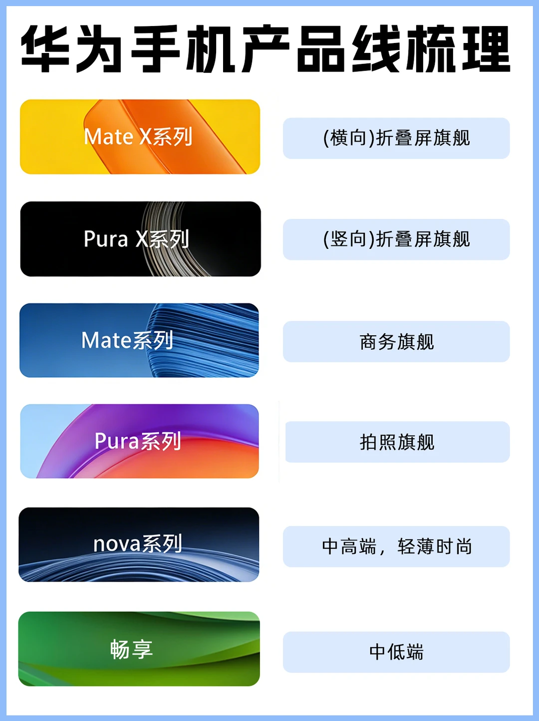 - Mate X/Pura X系列:折叠屏旗舰,横向/竖向两种形态,高端尝鲜