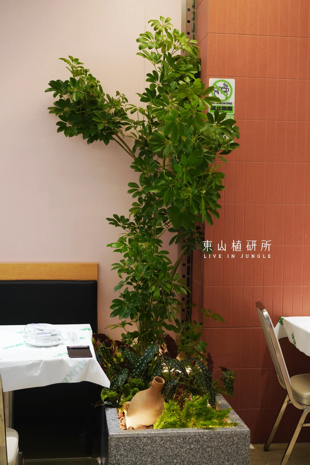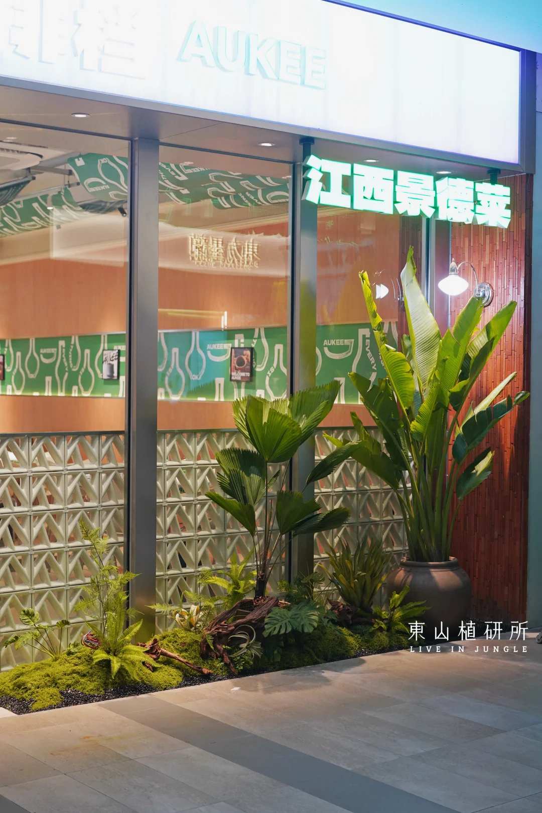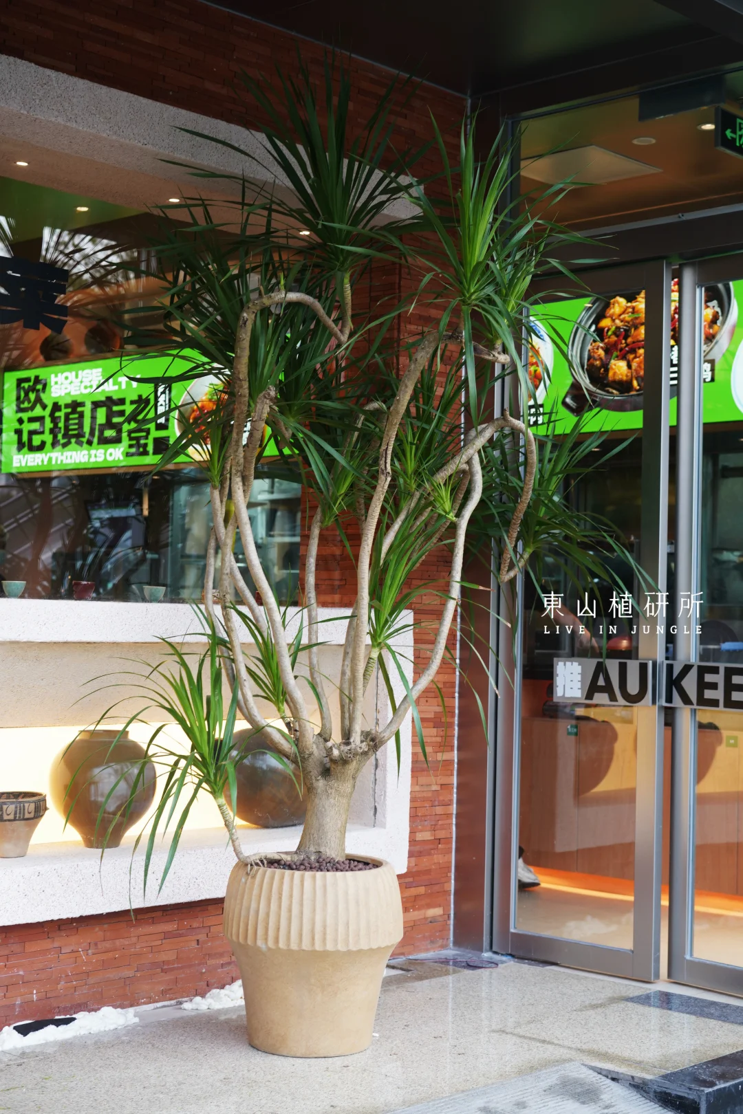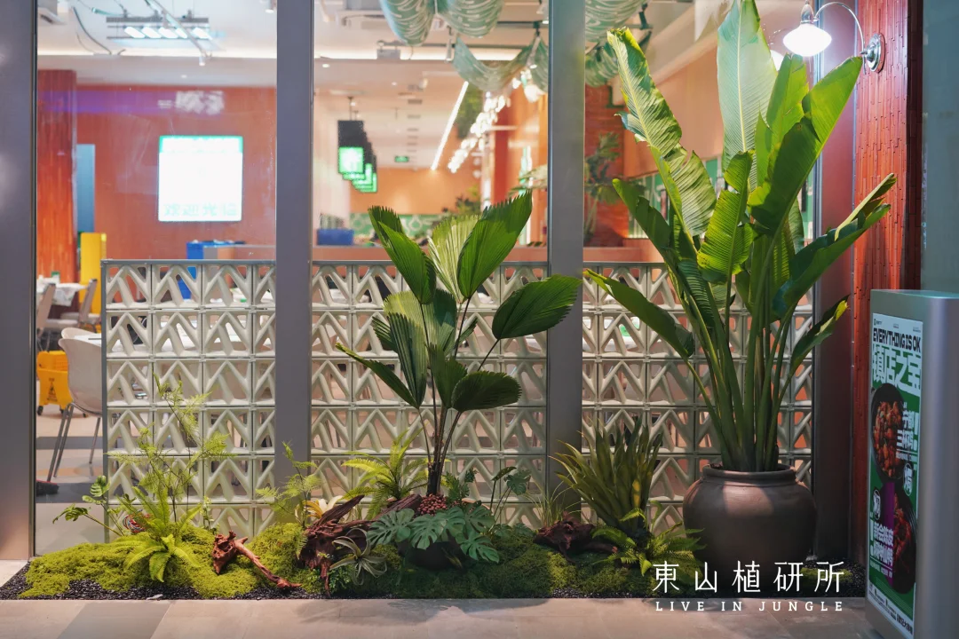 餐厅绿植布置 用热带绿植做外摆花箱,既装点了门面,又借围合布局营造室外用餐区域的舒适氛围。晚风穿过叶片,把大排档的热闹裹进自然里,坐下来感受一日三餐里最治愈的烟火气。 室内用餐区用绿植与陶罐结合,在餐桌旁打造植物角,让热饭的香气都带着自然的温柔。 考虑到商场的植物生长条件有限,室内入口以仿真绿植造景为主,搭配大型绿植盆栽。 Client: 广州·欧记大排档 Plant Design: 東山植研所 ——————
