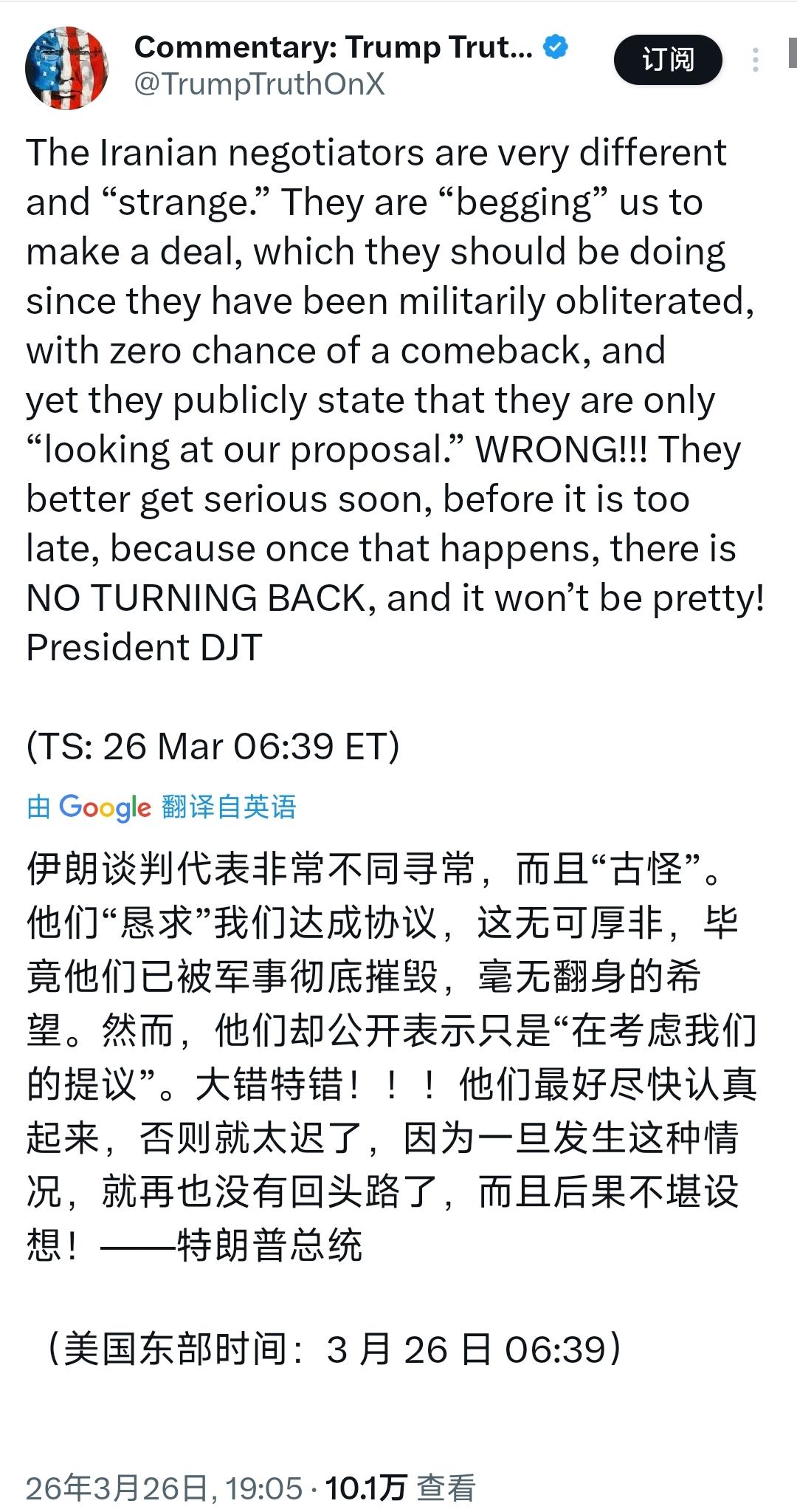 特朗普今晚(北京时间3月26日晚)写道:“伊朗谈判代表非常不同寻常,而且‘古怪’。他们‘恳求’我们达成协议,这无可厚非,毕竟他们已被军事彻底摧毁,毫无翻身的希望。然而,他们却公开表示只是‘在考虑我们的提议’。大错特错!!!他们最好尽快认真起来,否则就太迟了,因为一旦发生这种情况,就再也没有回头路了,而且后果不堪设想!” [机智]评几句:特朗普的这段发文再次将其谎话连篇、气急败坏的丑态暴露无遗,满口虚妄之词尽显霸权式的蛮横与心虚。他称伊朗被军事彻底摧毁、谈判代表恳求谈和,可事实是伊朗始终强硬否认与美谈判,其导弹和无人机依然在反击,而且依托霍尔木兹海峡掌控权让美方付出一定代价。美方一边加码军事部署酝酿对伊打击,一边靠编造谎言营造谈判假象,特朗普歇斯底里的威胁,不过是为掩盖其军事施压无果、骑虎难下的窘境。这番颠倒黑白的叫嚣,骗不了国际社会,也吓不退伊朗。