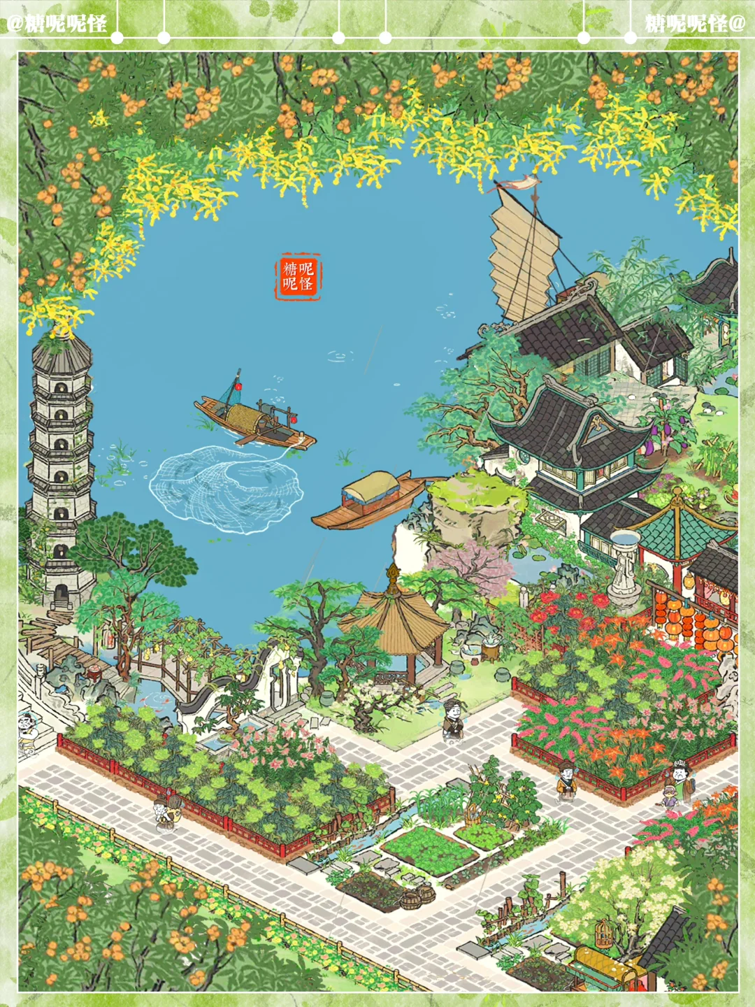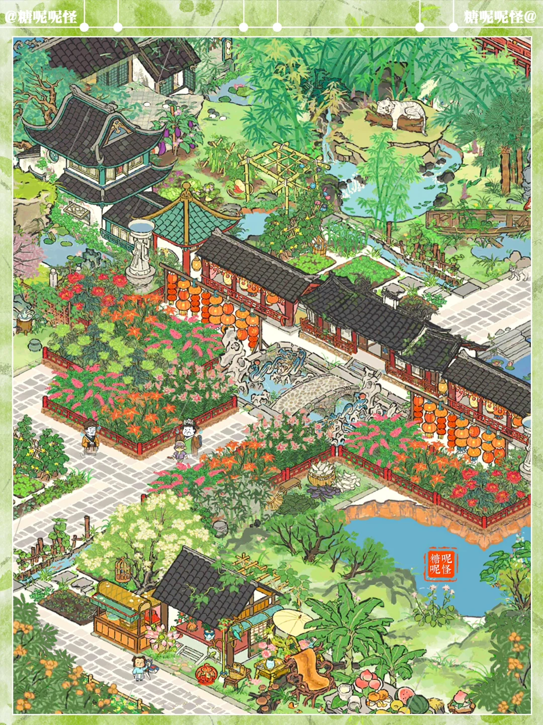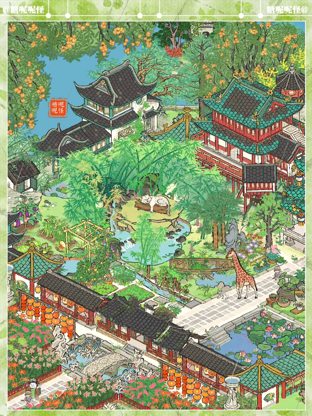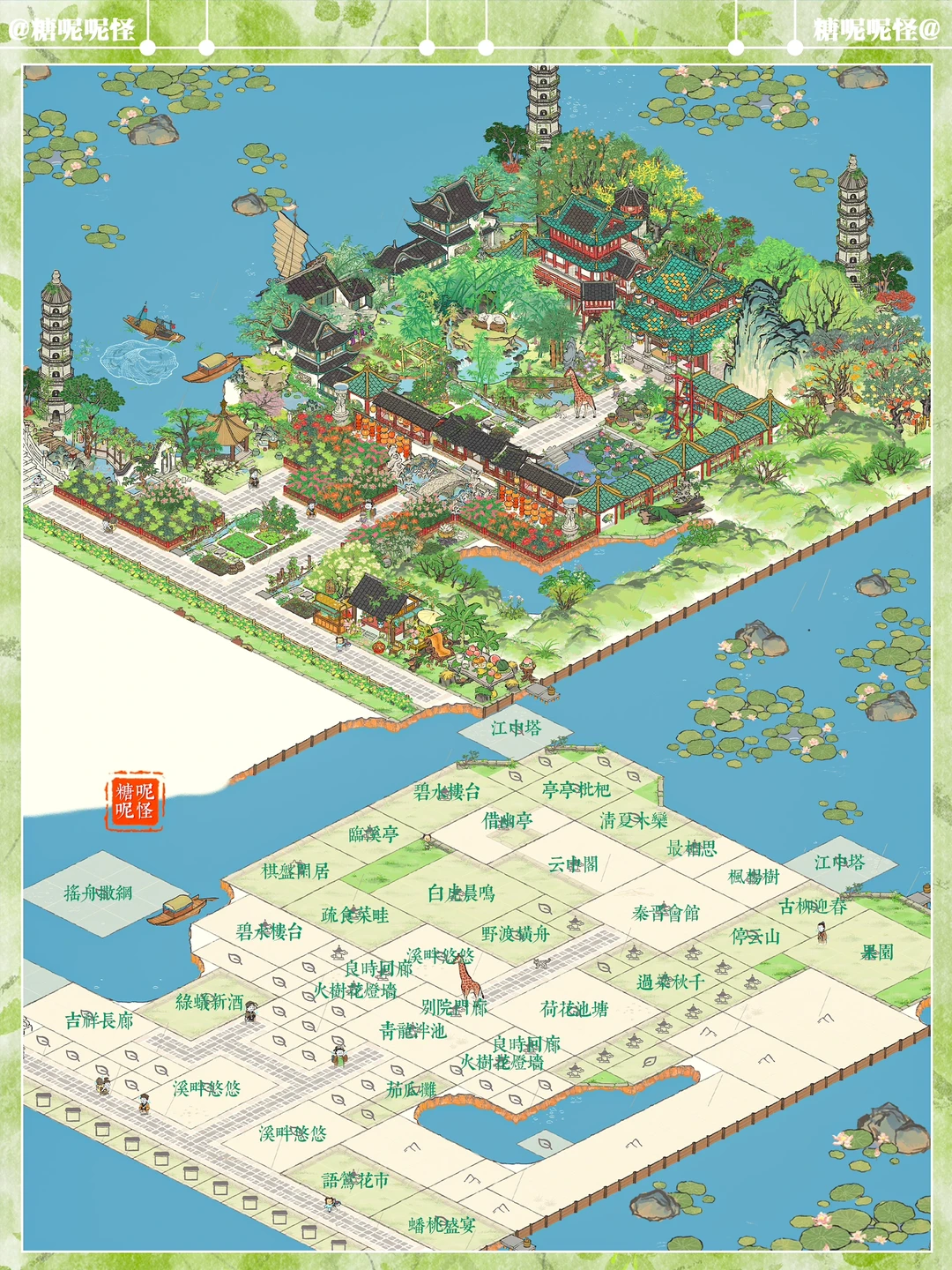 地点:扬州府明月边+停云边+春江边 建筑:秦晋会馆|云中阁|借幽亭|荷花池塘|过梁秋千|溪畔悠悠|白虎晨鸣|疏食菜畦|碧水楼台|临溪亭|棋盘闲居|绿蚁新酒|吉祥长廊|青龙泮池|良时回廊|火树花灯墙|古柳迎春|清夏木栾|亭亭枇杷|最相思|古柳迎春|果园|江中塔