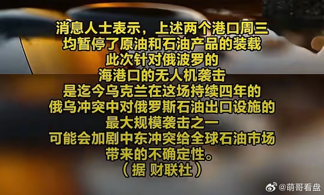 油价这是又要涨了吧!油价涨,黄金就会降吧!据报道,俄罗斯输油港口接连被炸,输出能力已经下降了四成!乌克兰这是看到俄罗斯卖油卖的热火朝天的眼红了吧!最近炸港口的力度和频次比以往都来的猛烈!这样越打,油价越高,最终获利的不还是产油国吗!再说乌克兰本身也是严重依赖成品石油的进口!油价涨了对他自己也没好处啊!杀敌一千自损八百!
