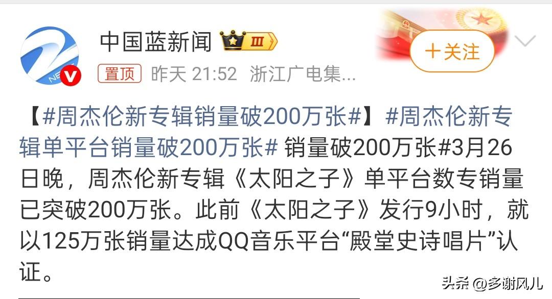 顶流就是顶流,36小时登顶2026年数字专辑年榜首位,恐怖如斯! 周杰伦近日携新专辑《太阳之子》归来,新专辑一发布,36小时便席卷各大榜单,QQ音乐单平台销量破200万张,全平台销量218万张,全平台销售额破9000万。周杰伦这种顶流,赚钱速度太恐怖了! 听了一下新专辑,本来很期待《湘女多情》,结果喜欢上了《淘金小镇》,嗯这首《湘女多情》同过往的中国风歌曲相比,感觉拉了啊!