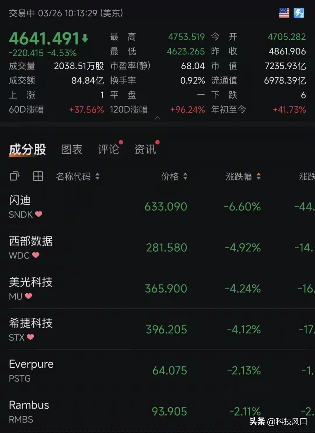 预警!谷歌TurboQuant引发雪崩!美股存储芯片连续大跌,惯性下杀 一、美股存储芯片连续下杀 3月下旬美股存储板块连续重挫,3月25日美光科技跌4.24%,此前一日跌3.40%,短期连续大幅下挫;闪迪单日大跌6.60%,西部数据跌4.92%,希捷科技跌4.12%,存储板块指数单日重挫4.53%,已形成明确的惯性下跌趋势。 二、大跌核心逻辑 1. 技术预期崩塌:谷歌TurboQuant算法将AI推理GPU缓存占用大幅压缩,市场直接解读为AI存储需求长期萎缩,推翻此前AI带动存储高增长的核心逻辑。 2. 获利盘集中出逃:美光、闪迪均创历史新高,估值泡沫明显,利空成为资金集中兑现的导火索。 3. 基本面担忧加剧:美光公布高额资本开支计划,市场担忧现金流承压、行业供给过剩,叠加高利率环境压制高估值科技股,多重利空共振。 4. 恐慌惯性形成:连续大跌引发市场避险情绪蔓延,抛盘持续涌现,形成“下跌—恐慌—再下跌”的循环,短期止跌信号并未出现。 三、A股影响与理性判断 A股存储芯片全球联动性强,被动跟随美股承压,难以独立走强。其中DRAM、AI推理敏感型标的受冲击最明显,NAND模组厂随涨价预期降温走弱,端侧利基型存储相对抗跌,但也难完全脱离板块恐慌情绪。 四、谨慎操作建议 短期观望为主,不宜盲目抄底,尊重美股惯性下跌趋势,避免介入下跌中继; 中期等待美股止跌企稳、行业供需数据验证后,再考虑聚焦国产替代主线小仓位布局,全程要严控风险,不宜盲目抄底。 以上根据公开信息整理,不构成投资建议。 hbm ai推理